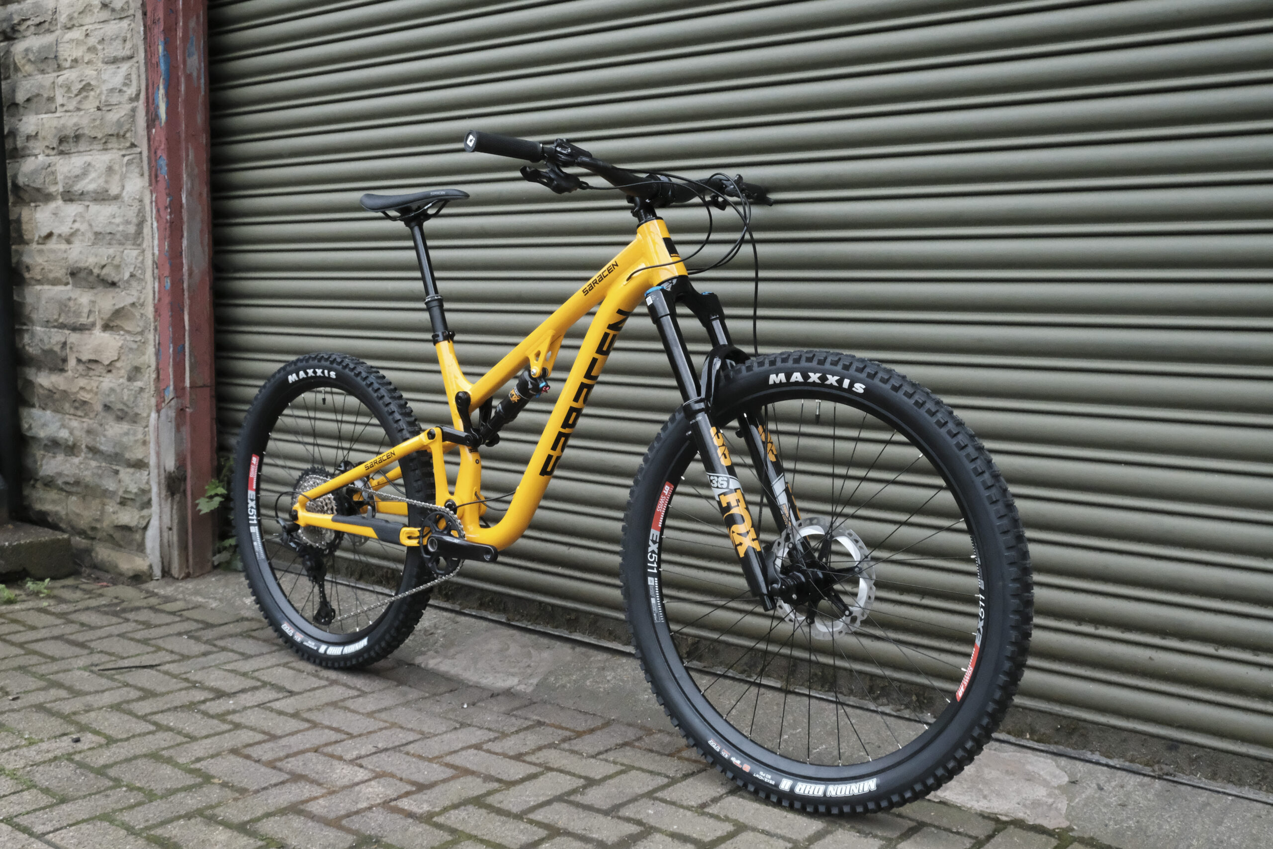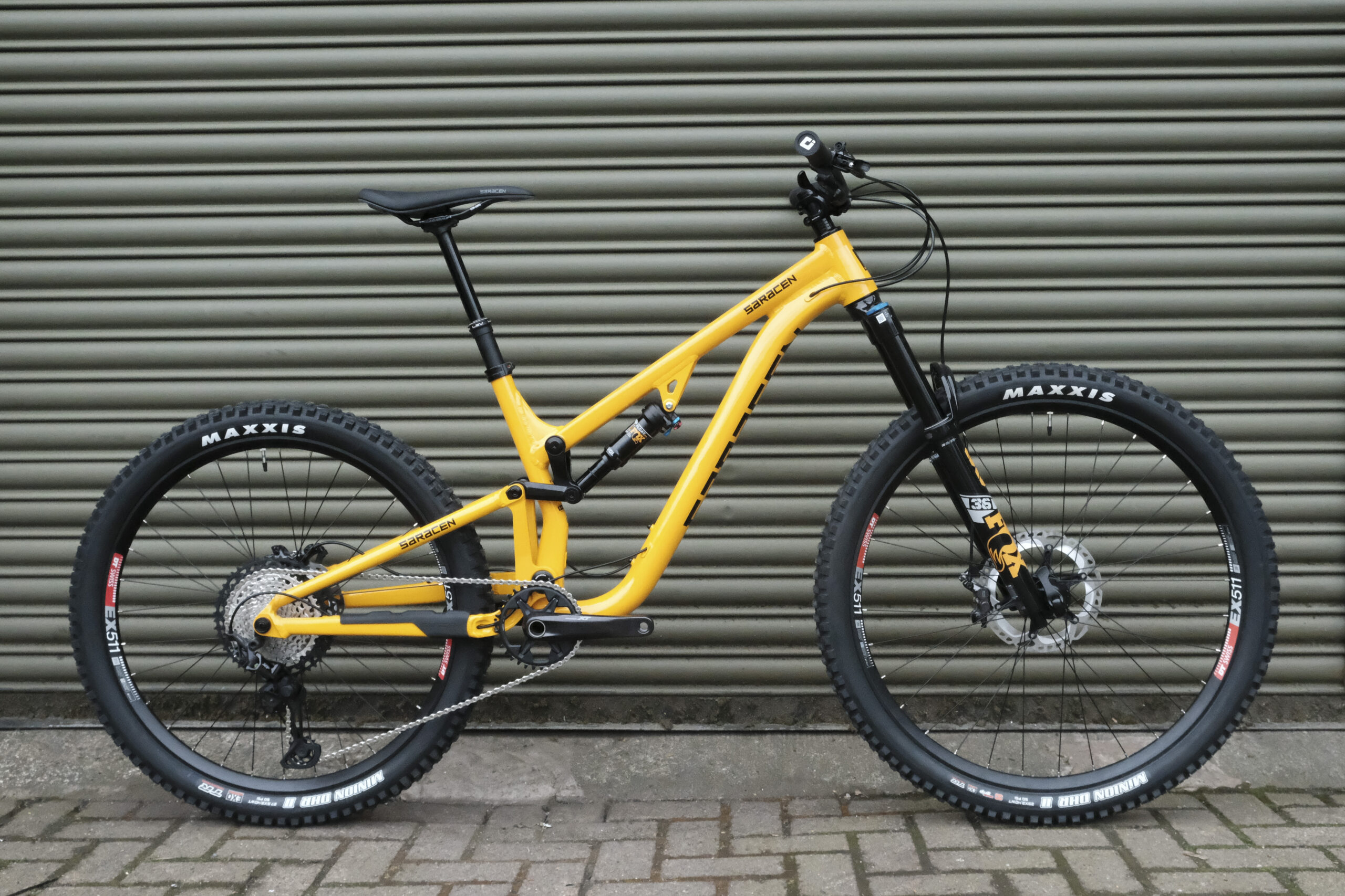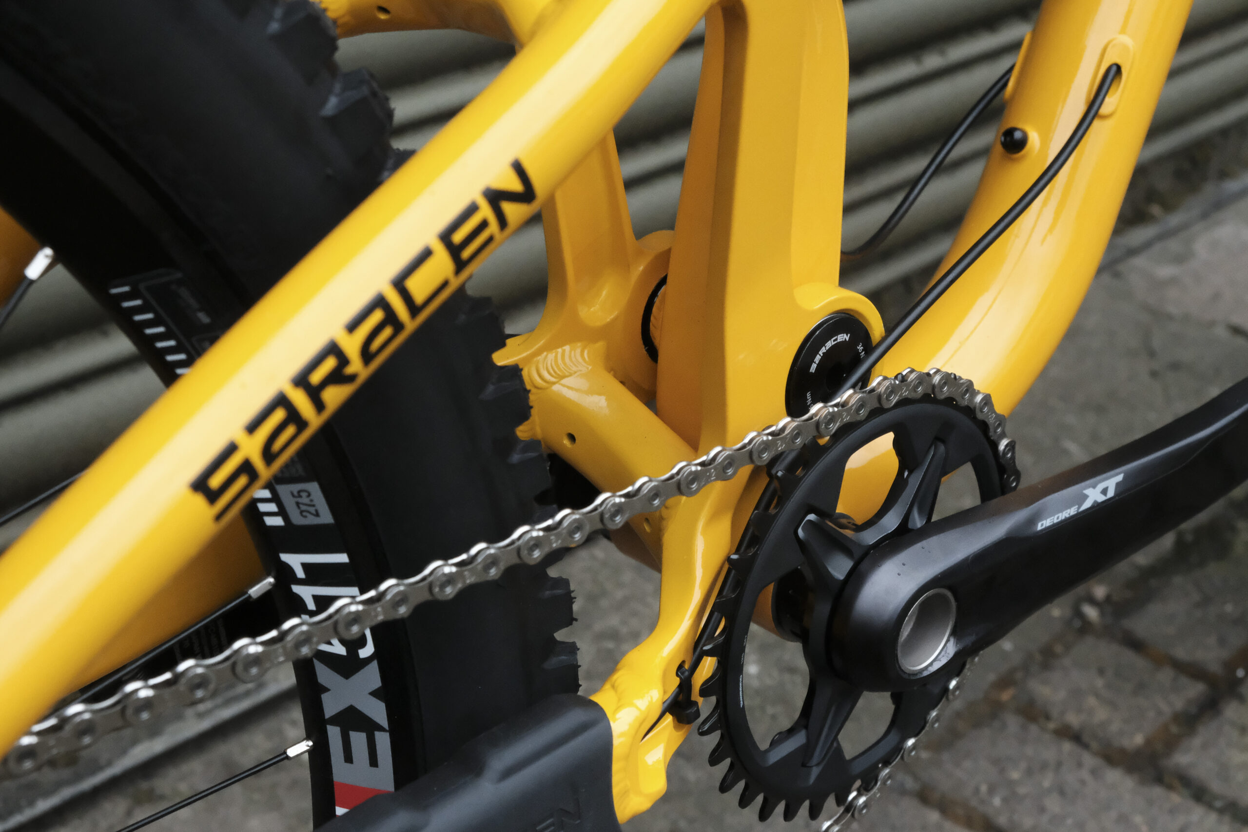 Another Ariel from Saracen that looks the absolute bee’s knees. Literally. This is one of those Normal Mountain Bikes that we used to hear about back in the day. Aluminium. 130mm rear travel via Saracen’s own TRL linkage driven single pivot. 140mm travel Fox 36 up front. Shimano XT everywhere. DT Swiss EX511 rims. 170mm KS dropper post. 450mm stem. 780mm bars. What isn’t so very back-in-the-day is the wheel size and the geometry. This is a mullet. The Small and Medium (this bike) Ariel 30 models come as mullet bikes. The Large and X-Large models are full 29ers. Geometry-cally speaking this Medium has 410mm seat tube, 480mm reach (oof! yes!), 65° head angle, 76.5° seat angle, 440mm chain stays and 30mm of BB drop.