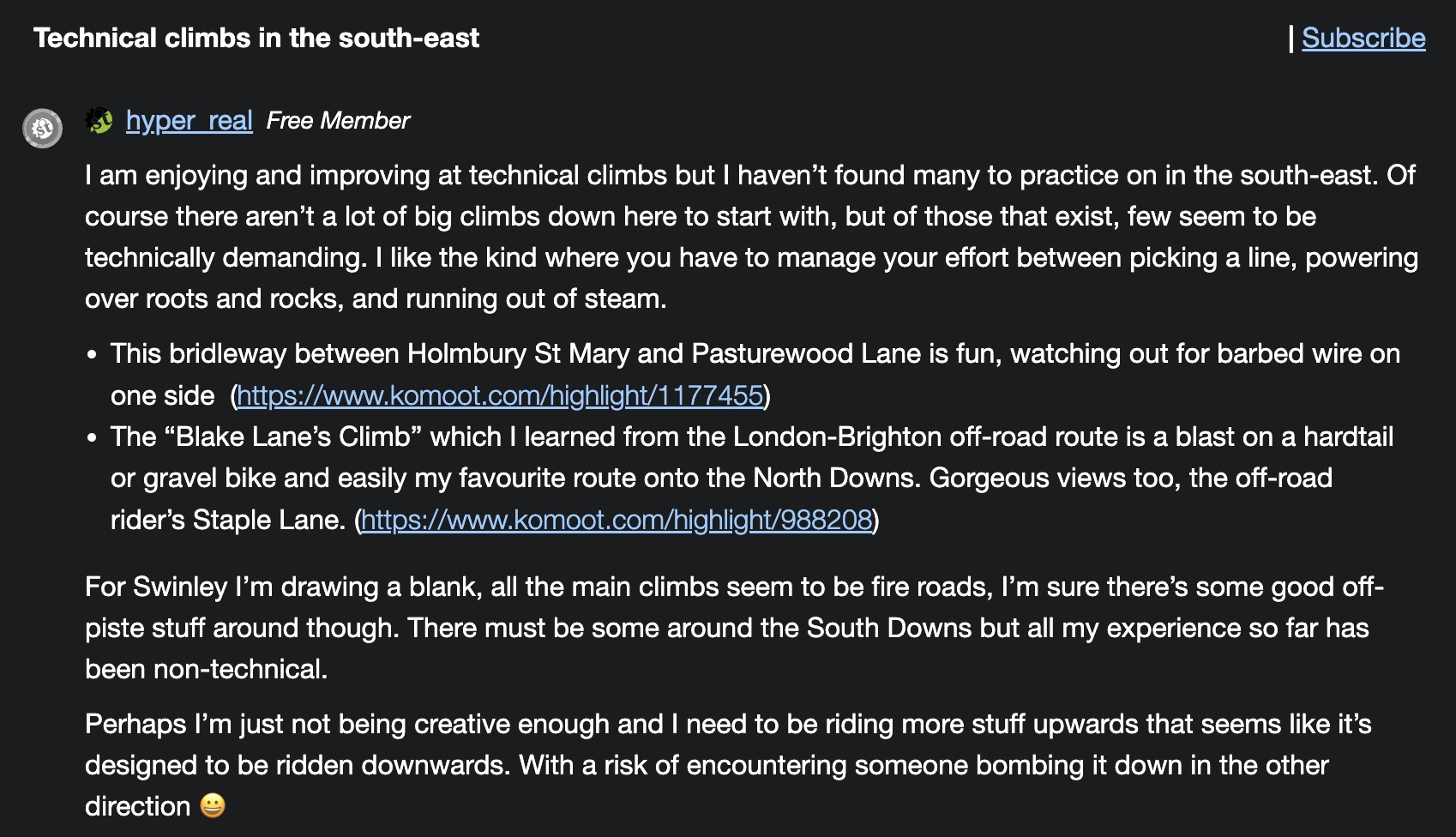 The winning TOTW in FGF gets a prize. So @hyper_real please email editorial@singletrackworld.com for your random prize (it will probably be a Singletrack Forum Bottle Opener). Don’t forget to include your postal address, as it really speeds up delivery logistics like. K thx bye!