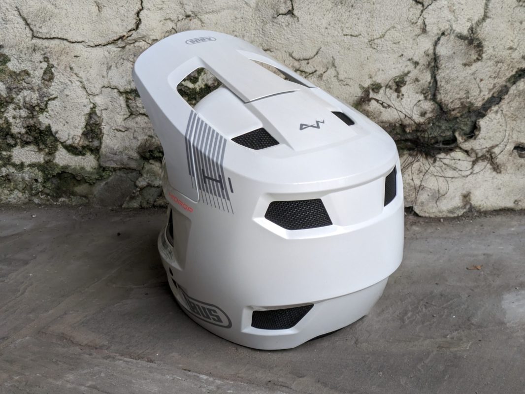 This is not a converitable helmet. It’s not a super lightweight full facer. It’s not even one of the newer breed of midweight(?) full face helmets (like the Abus AirDrop helmet review). It’s a full-on downhill specific crash hat. The ABS outer shell makes the helmet impact-resistantl its shock-absorbing function is enhanced by the EPS and EPP core.