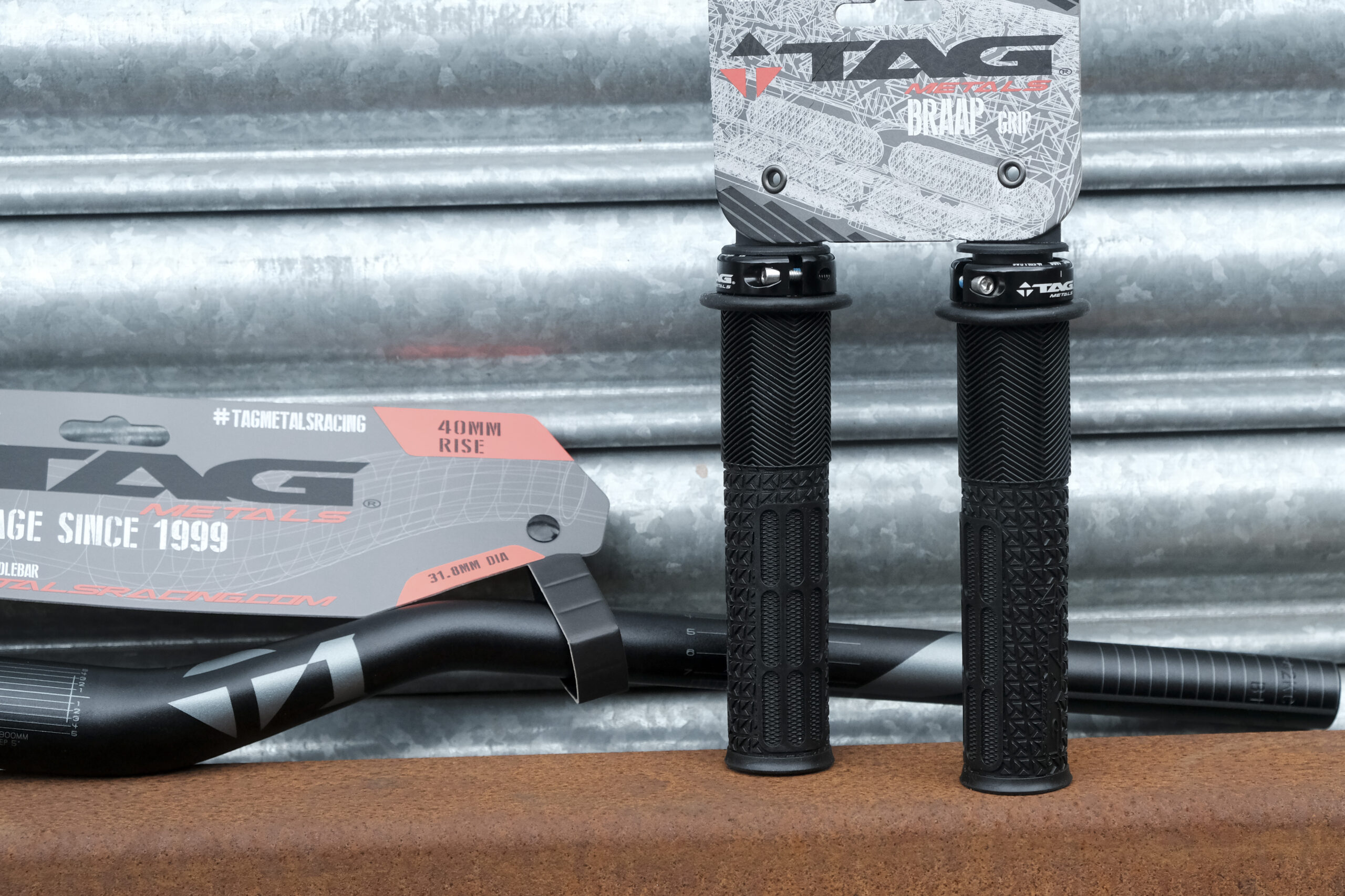 A little bit Deathgrip-py in the overall dual-diameter (29/31mm) design but different enough to be er, different. And they’re also called ‘Braap’, so that’s good. Braap grips have a SAS (Speed Align System) markings to help get them set up just-so,. 135mm ling. Seven colours available. are 135mm wide and are your in one of 7 colours to match your ride. TAG rubber compound based on their motocross grip appparently.