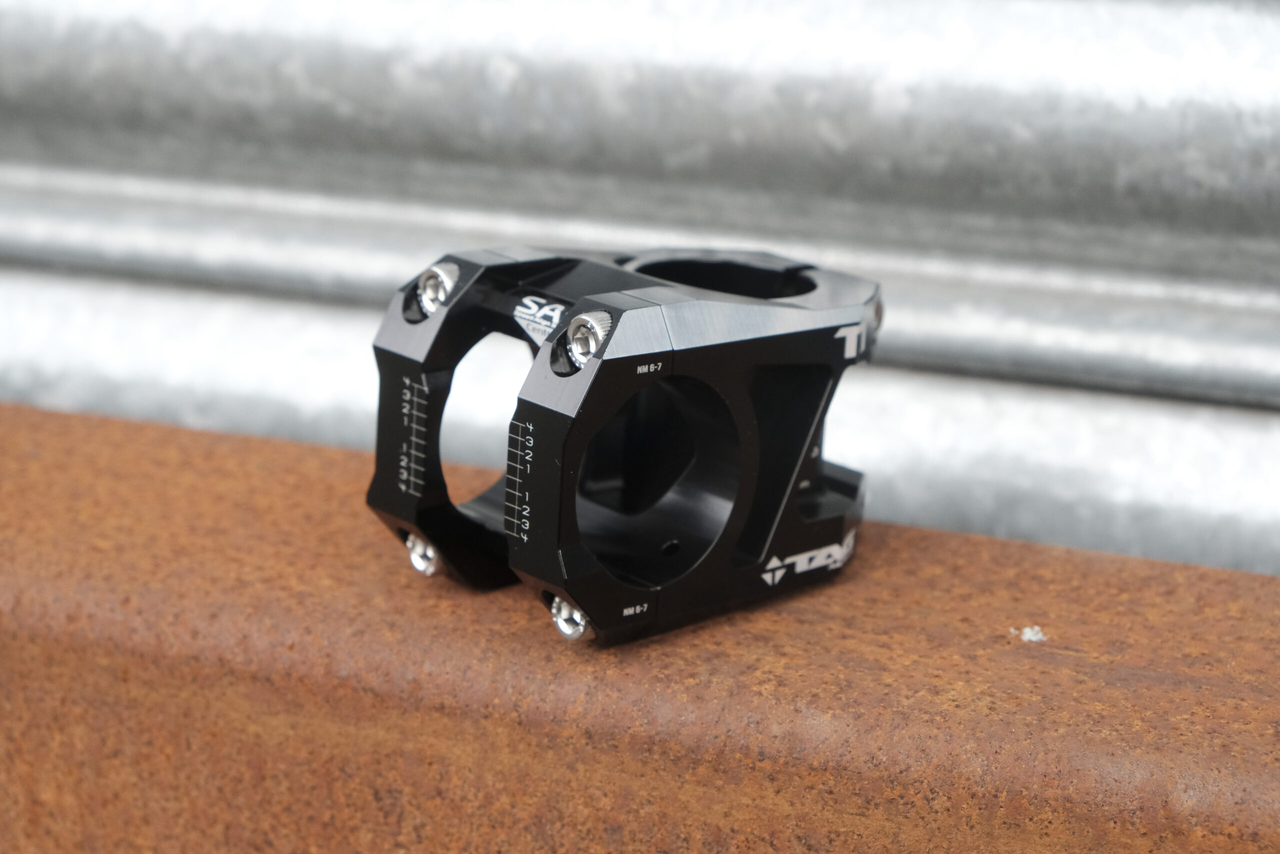 An aluminium handlebar in 31.8mm diameter and 40mm rise. Nice. 800mm wide but feature a handy cutting guide. 5° up sweep,. 7° back sweep. Shot-peened to give a hard-wearing and slightly textured finish. They also come in 35mm clamp diameter and a few other rises. The first of a trio of TAG Metals cockpit components that are destined for Amanda’s (remember her?) new Atherton S170 build.