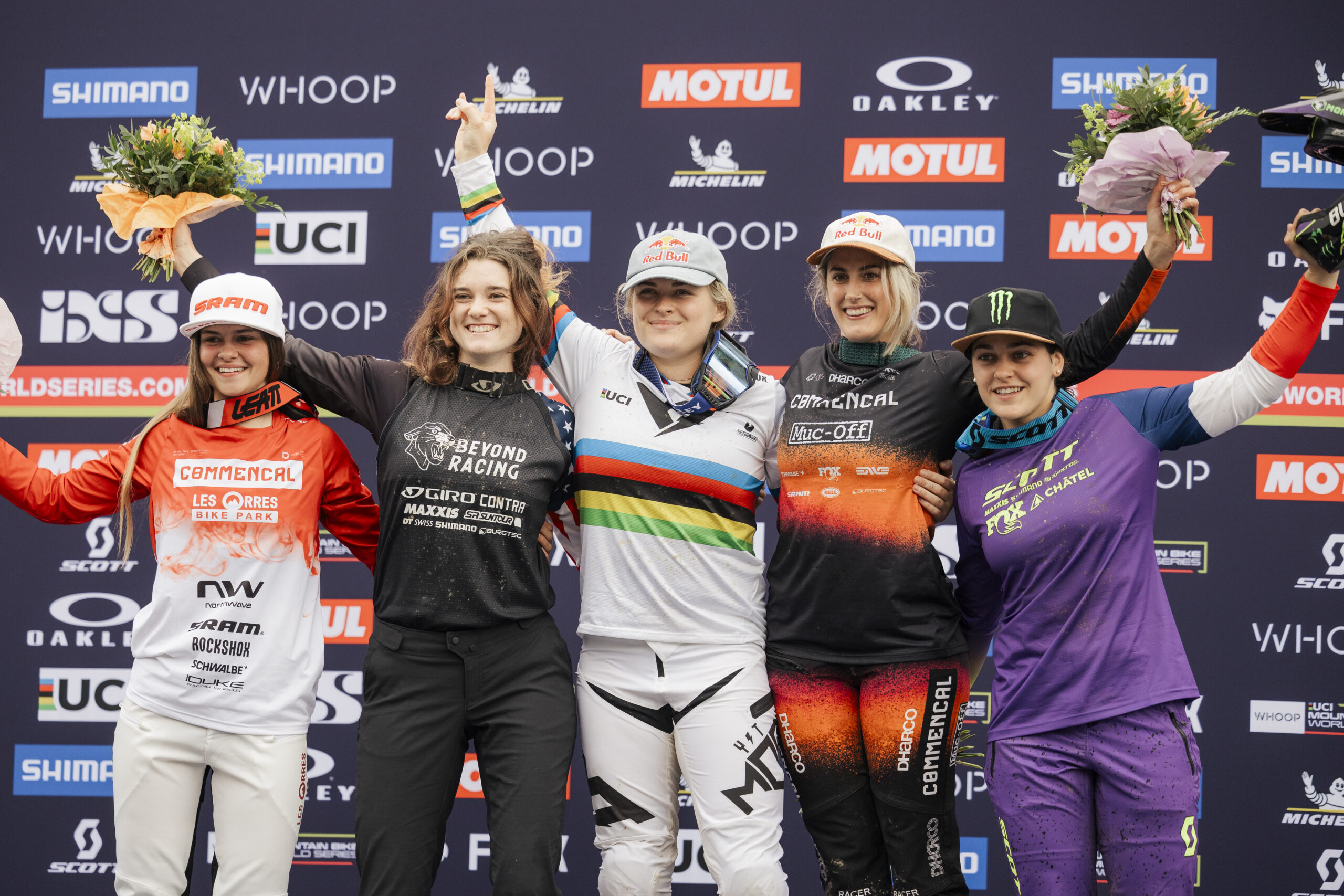 UCI World Champion and home favourite Valentina Höll (YT Mob) was the only rider left who could deny Newkirk the victory. The Austrian honoured the rainbow stripes with a stylish, rapid first half of the run. The only rider to clear the double early jumps, she approached the wall ride with a massive three seconds in hand. At that point all she really had to do was get down, but she wasn’t content with simply taking the win. Precise drop-ins and impeccable handling gained her even more on those lower parts of the course that had frustrated several rivals. The Austrian fans erupted as Höll crossed the line to take the victory by an enormous 7 seconds.