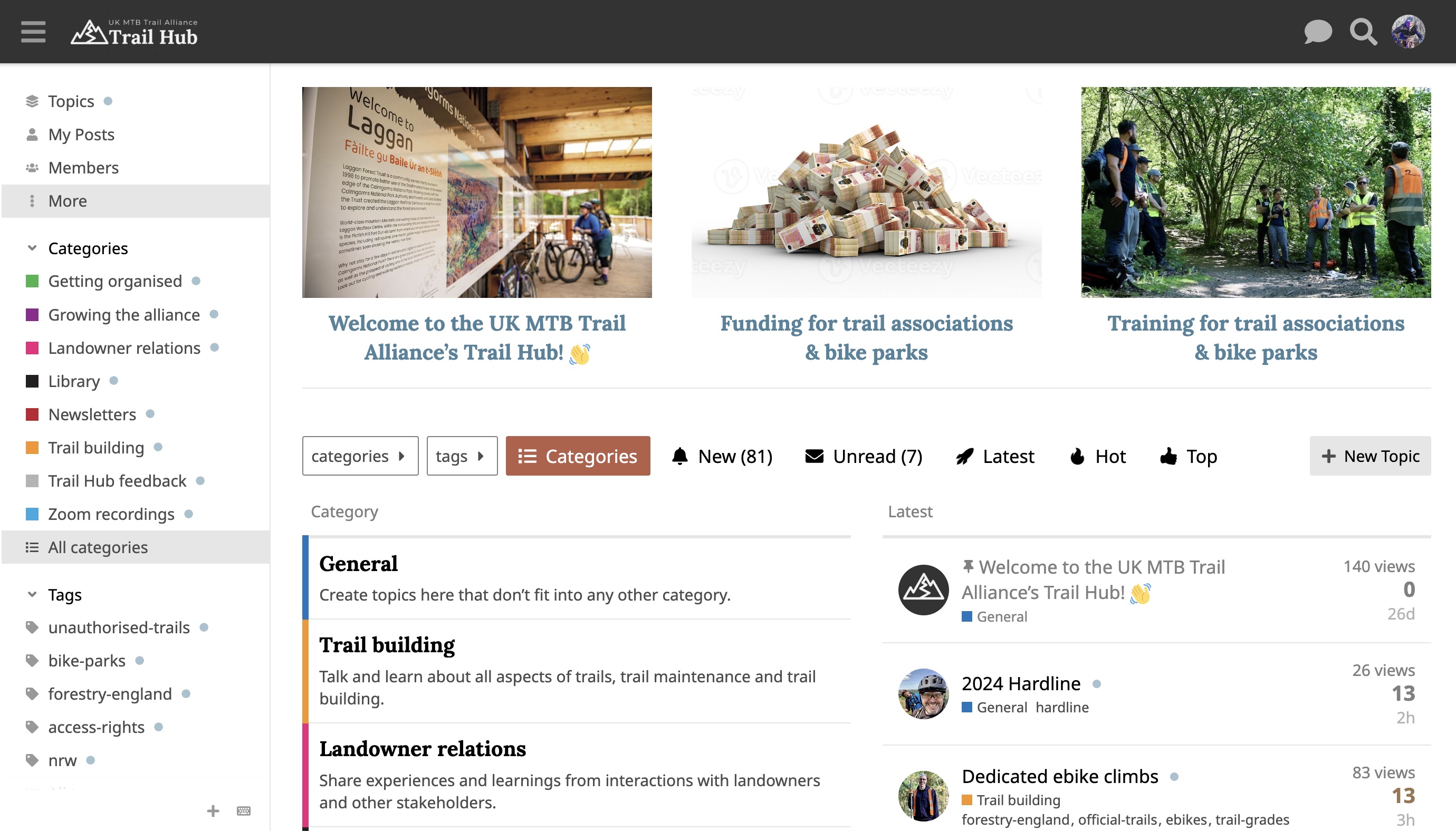 The Trail Hub is the UK MTB Trail Alliance’s knowledge sharing platform. It’s launched to over 200 users from trail associations, bike parks and informal trail groups. Its Library contains an array of useful information such as guides to funding, training, safeguarding, planning permission for trails, landowners’ liability, trail advocacy case studies, academic research and a host of other resources. There’s lots of discussion developing on the Trail Hub too, from how to map your trails, First Aid provision at bike parks, dedicated ebike climbs to favourite trail tools. The idea is if members have questions that other members might be able to help answer, they get on the Trail Hub and ask!