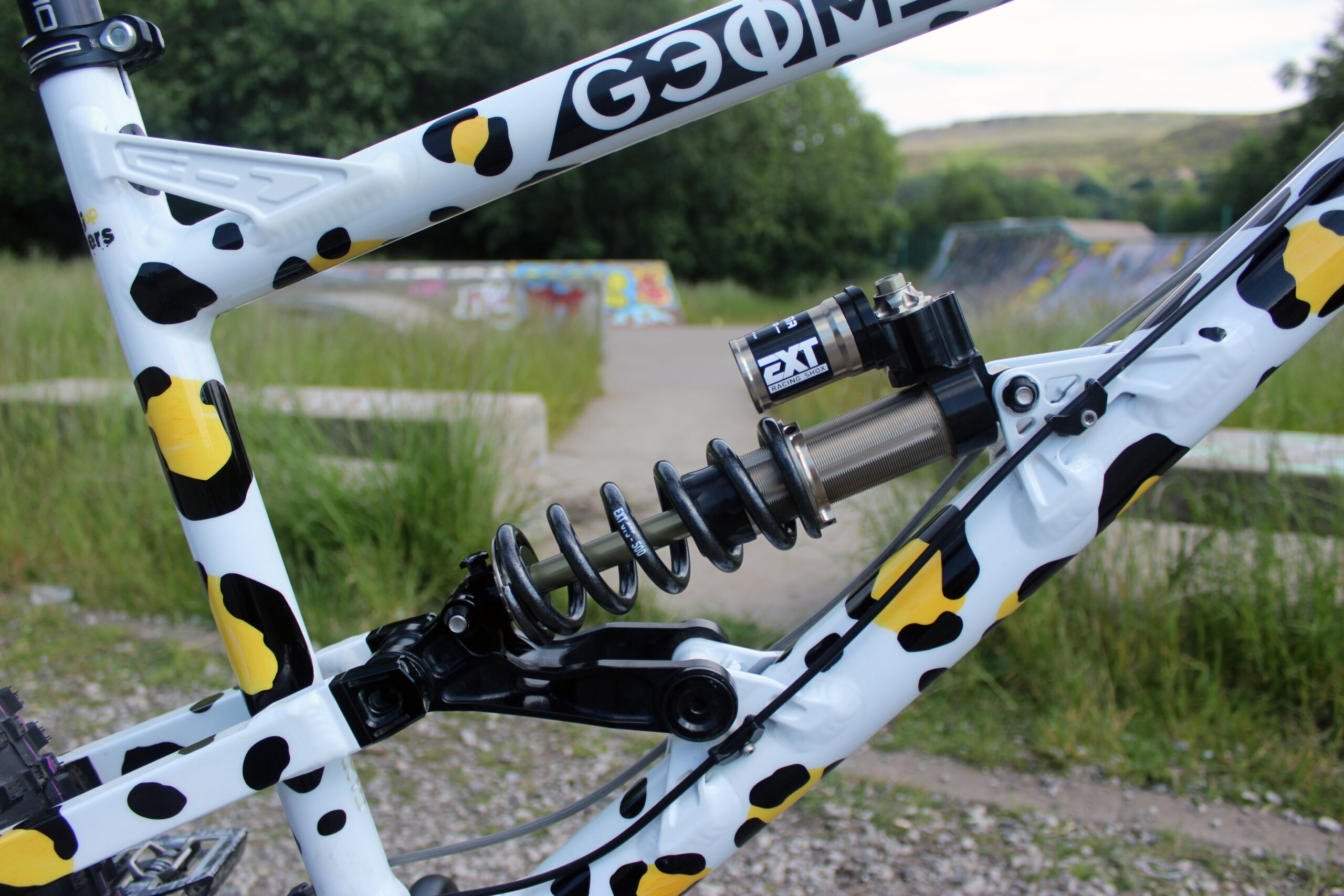 This is the ‘old’ XXL Geometron G1. I’m running the longer (250mm x 75mm) EXT Arma shock which gives 190mm rear travel in short travel mode and 210mm in long travel a la Paul Aston’s infamous set up. Unlike Paul, I’m running it in 190mm travel because the shorter travel has a lower BB height (363mm) and slacker Head Angle. I’d like the BB to be 10mm lower but the longer shock has more sag so the ‘actual’ BB probably isn’t too far off. 6.5mm seat stay mutators and the 54mm chain stay mutators give a 455mm chain stay. With that combination of shock and mutators it left me with a 61.5 degree Head Angle which was a tad too slack so, I’ve got a Works Components 1.5 degree Angle Headset in there to get the head angle to 63. Wheelbase is a whopping 1,410mm but it doesn’t feel that big to ride, partly due to the mullet set up I think.