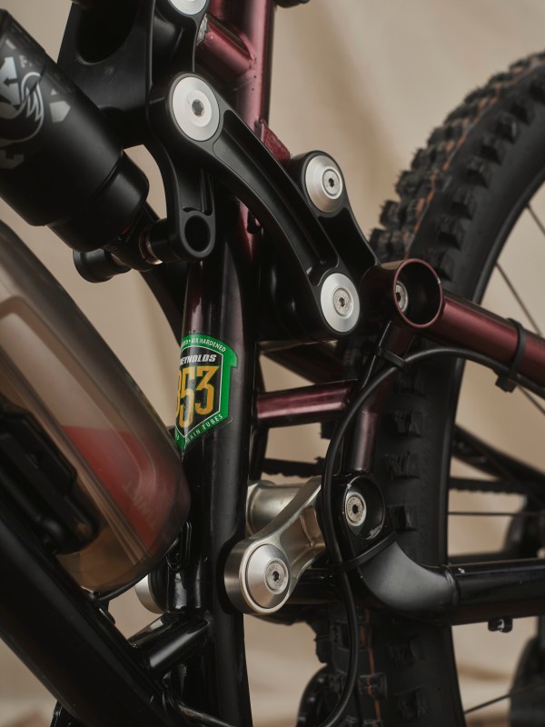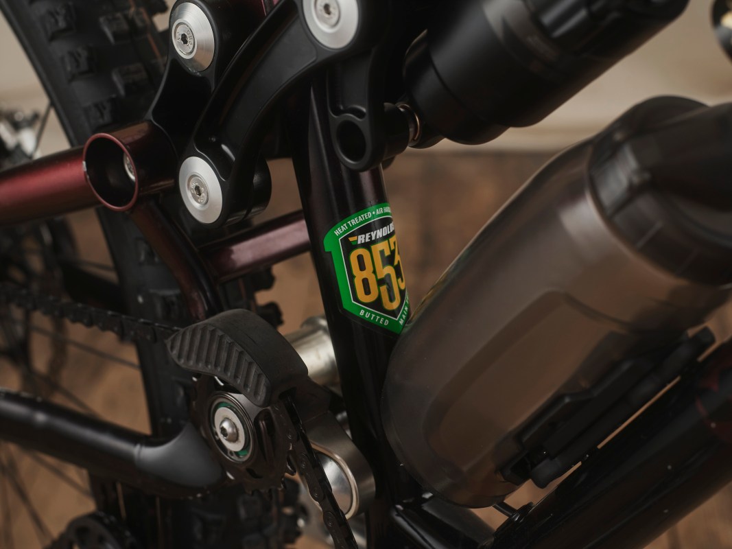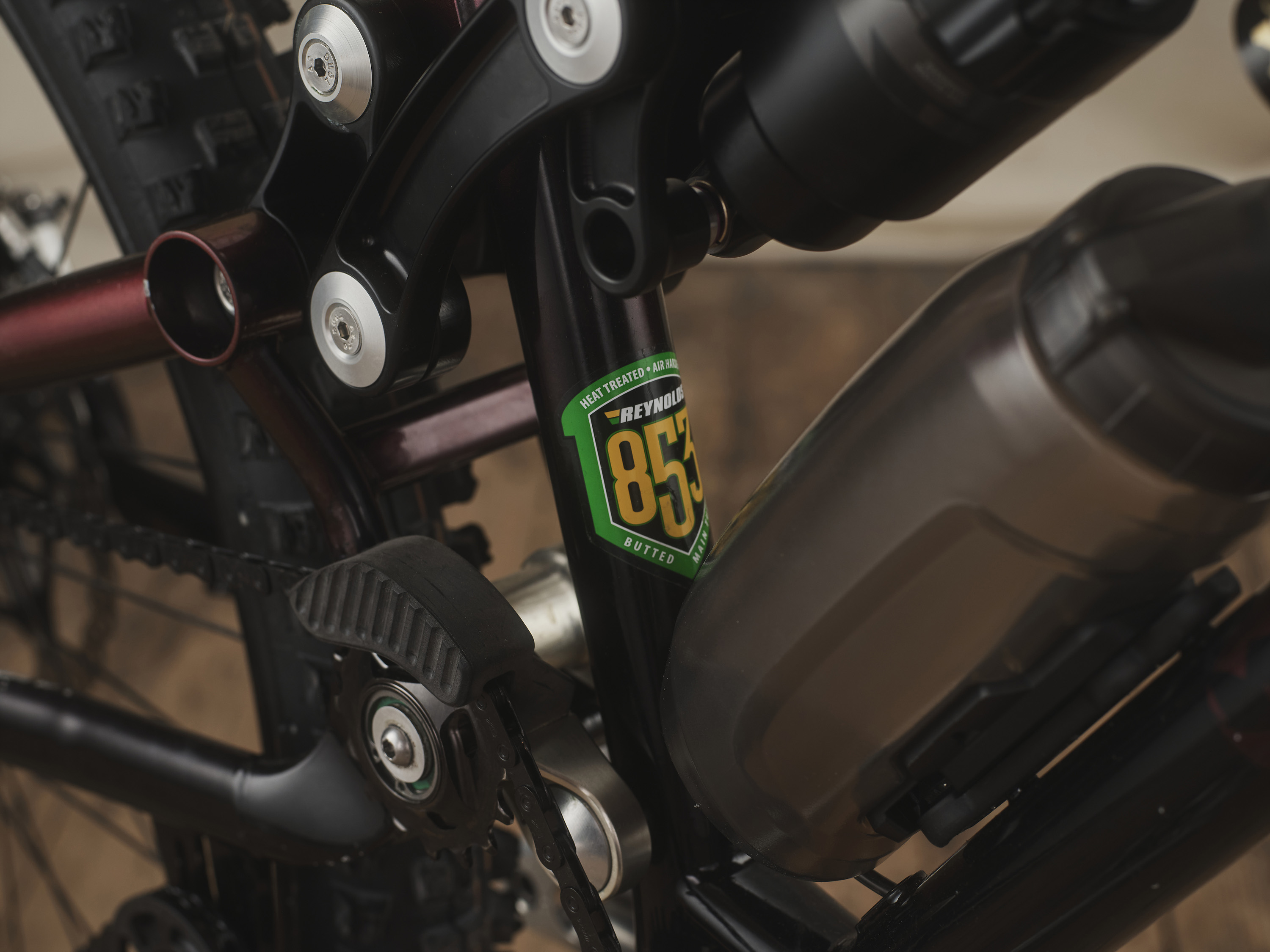This one’s called Marra, made out of 853 steel, properly made by Gavin at Coal Bikes in Warsall. So, he knows how to make a bike straight and strong and pretty. And as of Monday, we’ve improved the linkage to take out the problematic horseshoe link, which breaks shocks.