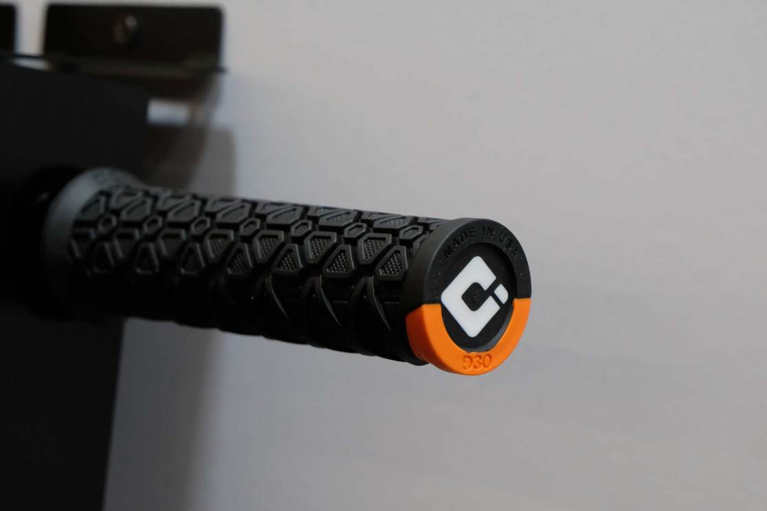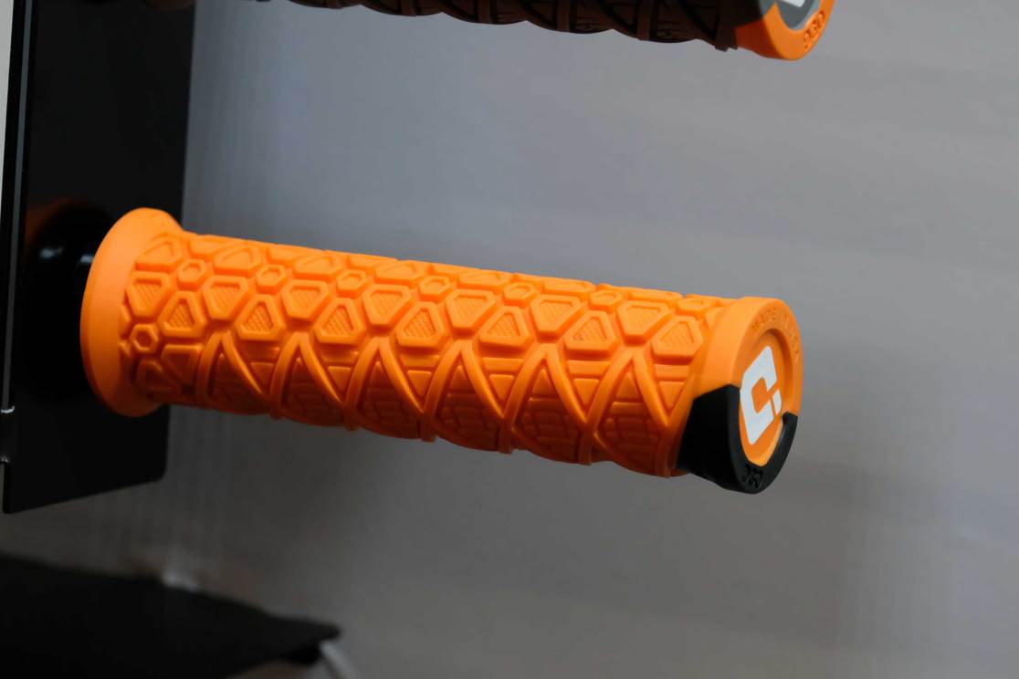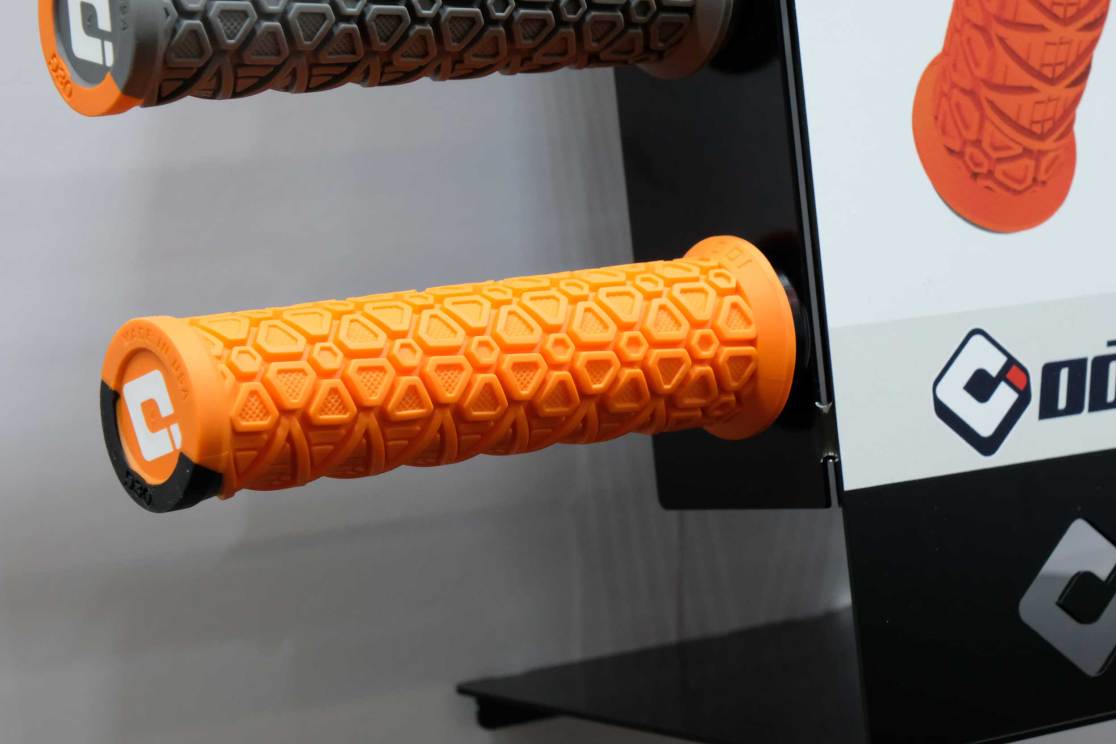 ODI has made a grip with D3O (the company, not necessarily the compound) – as the grip uses a new material that claims to do the opposite of ‘normal’ orange D3O, (which hardens under impacts). This grip is designed to absorb impacts by damping the impacts from the bar before they transfer to your hands. The only bit of ‘normal’ D3O is a small corner designed to shrug off bike ‘drops’ and protect you, and the ends of your bars.