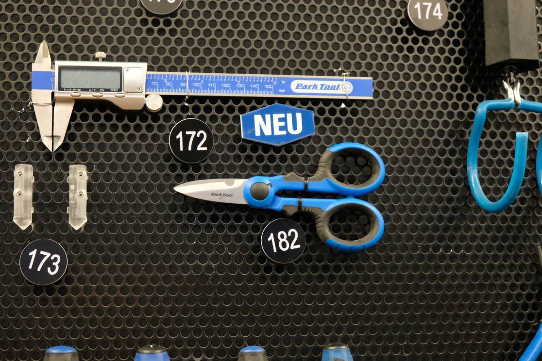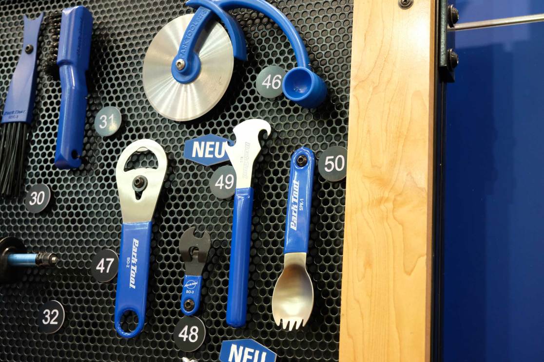 Park Tool has made a six-sided die shape that has impressions of fork top caps in. You know those Fox or Rockshox air cap covers that have been tweaked on so tight, you need a spanner to remove them? And then you scratch the anodising? This tool removes them easily and without scratching. Ace! I also loved their workshop scissors and the new bottle opener that looks like Park’s pedal spanner.