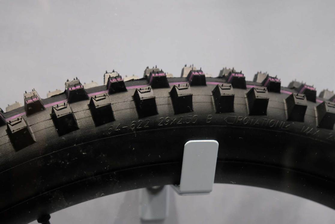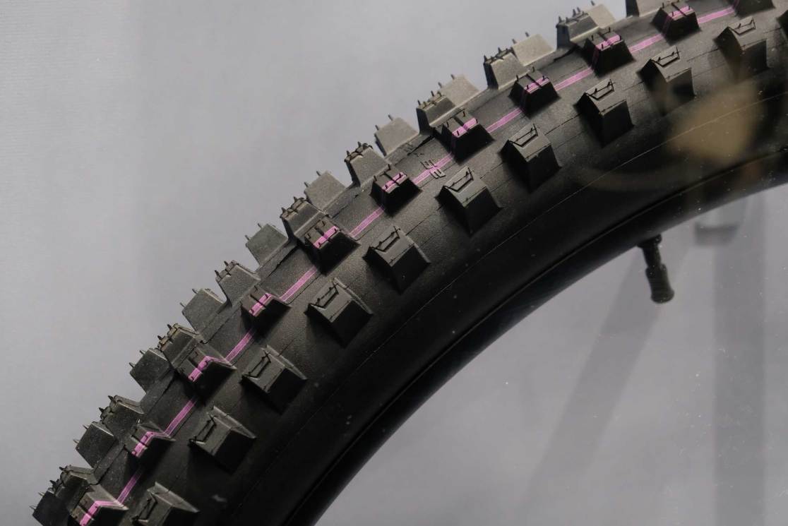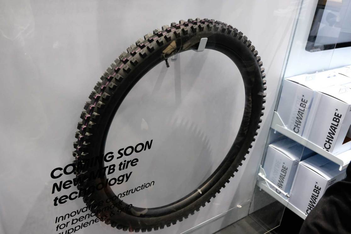 Schwalbe always has a few things hidden in plain sight, and I caught a glimpse of what might be termed a ‘racing ebike mud tyre’ or is it a downhill mudder? We’ll see what it’s best at when we get one in the office. The big hint about it seemed to be a new and much more flexible tyre carcass that helps deform to the ground without bottoming out. There will also be a general simplification of Schwalbe’s complicated system of different tyre carcasses and rubber durometers in general too, so that future tyres will be easy to choose based on tyre flexibility/puncture resistance and grip.