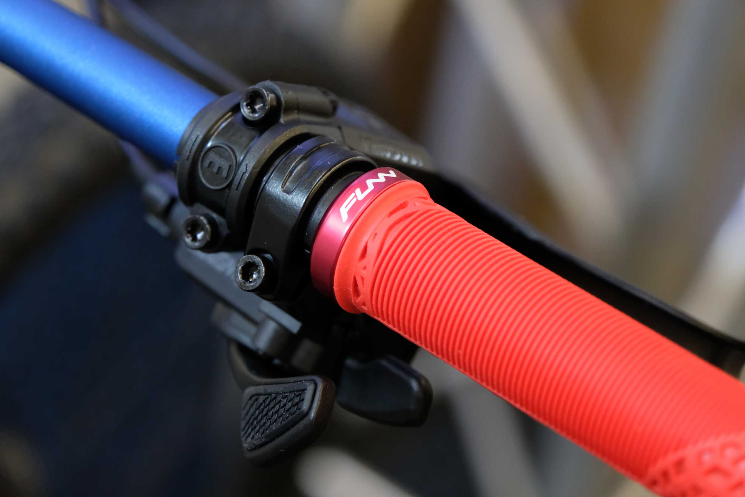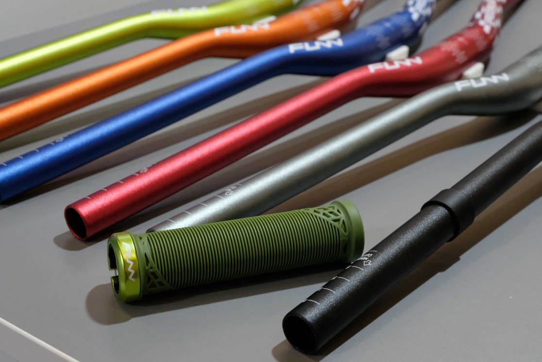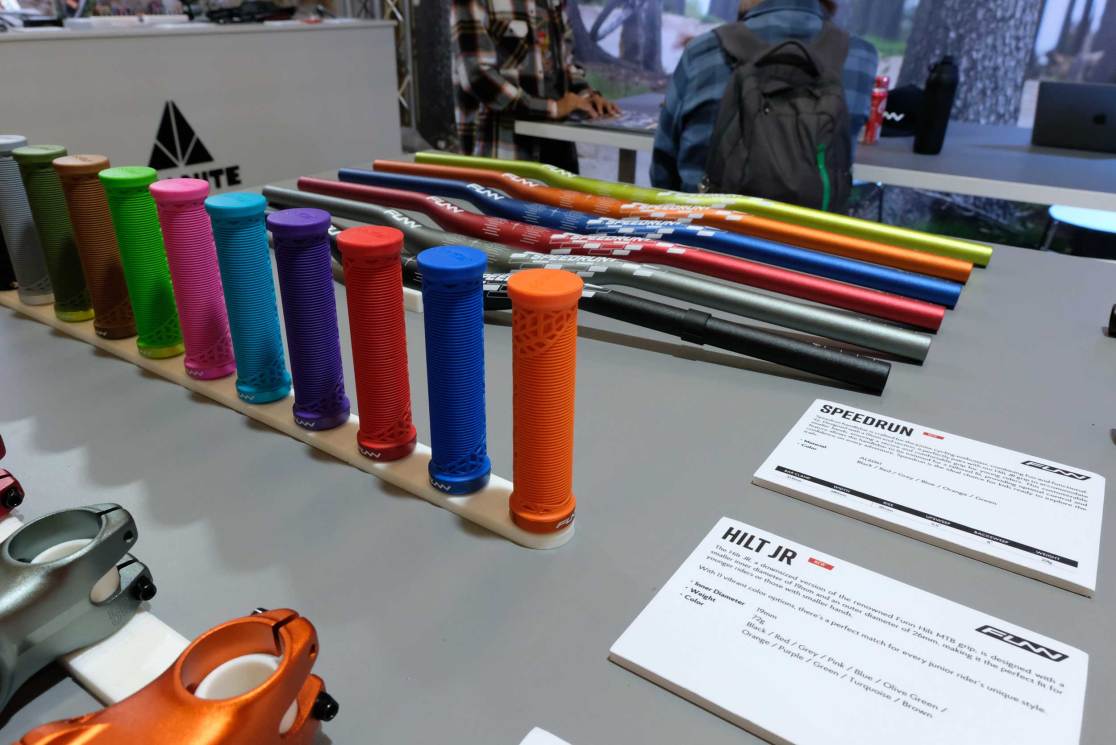 FUNN showed the new Speedrun and Hilt Jr grips, specially downsized for smaller hands. Now, we’ve seen thinner diameter bars for small grips before, but there’s usually a big flare out where the bar needs to return to standard diameter to fit brake levers and shifters. FUNN simply gets around this by keeping the bar thin (and more flexible and trimmable in width) and supplying four shims so that your brakes, shifters and droppers will fit on. Clever.