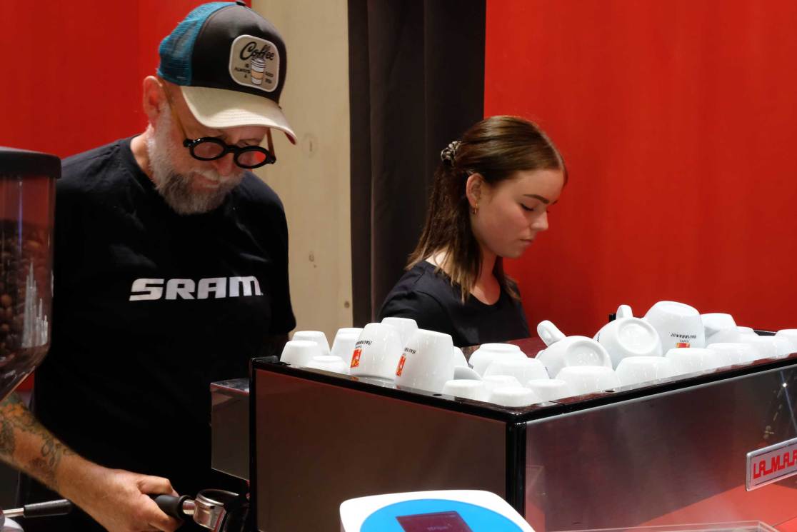 SRAM’s booth is always busy. There are many, many shiny things there – electric gears, the latest suspension and some top innovations. There’s also a great coffee machine, so it was definitely the booth to head to first thing.
