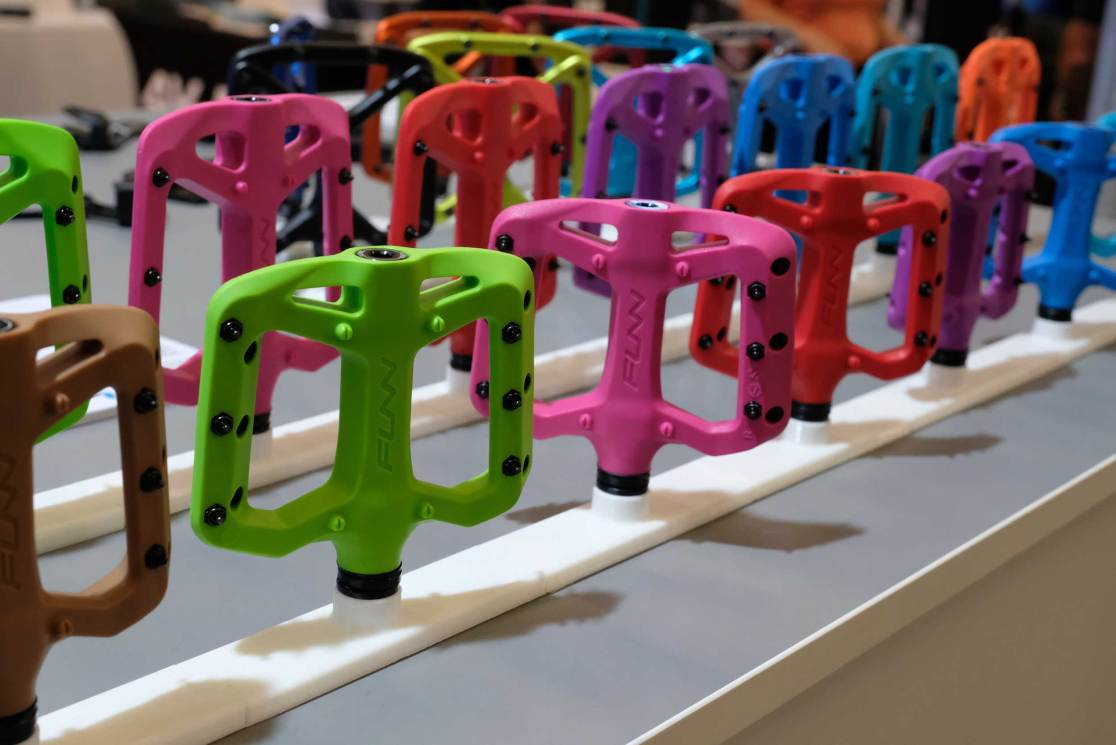 Not stopping there, FUNN also showed a range of ‘mini-me’ Taipan S thermoplastic flat pedals that look like the grown ups’ pedals, only smaller for smaller feet (95mm x 80mm instead of 105x100mm of adult pedals). However, one of the newbie issues with flat pedals is mashing shins and calves with pedal pins on slips and crashes. FUNN has (again, simply) rounded off the ends of the replaceable pins so they remain grippy, but are less fond of flesh.