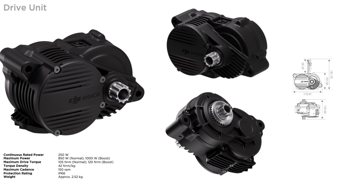 Tackle Terrain with Confidence At the heart of the Amflow PL is the DJI Avinox Drive System incorporating multiple cutting-edge technologies in both software and hardware design. The drive unit features a compound planetary gearset, providing industry-leading power-to-size ratio, with 105 Nm torque and peak power output of 850 W (nominal power output of 250 W) from a drive unit weighing just 2.52kg.