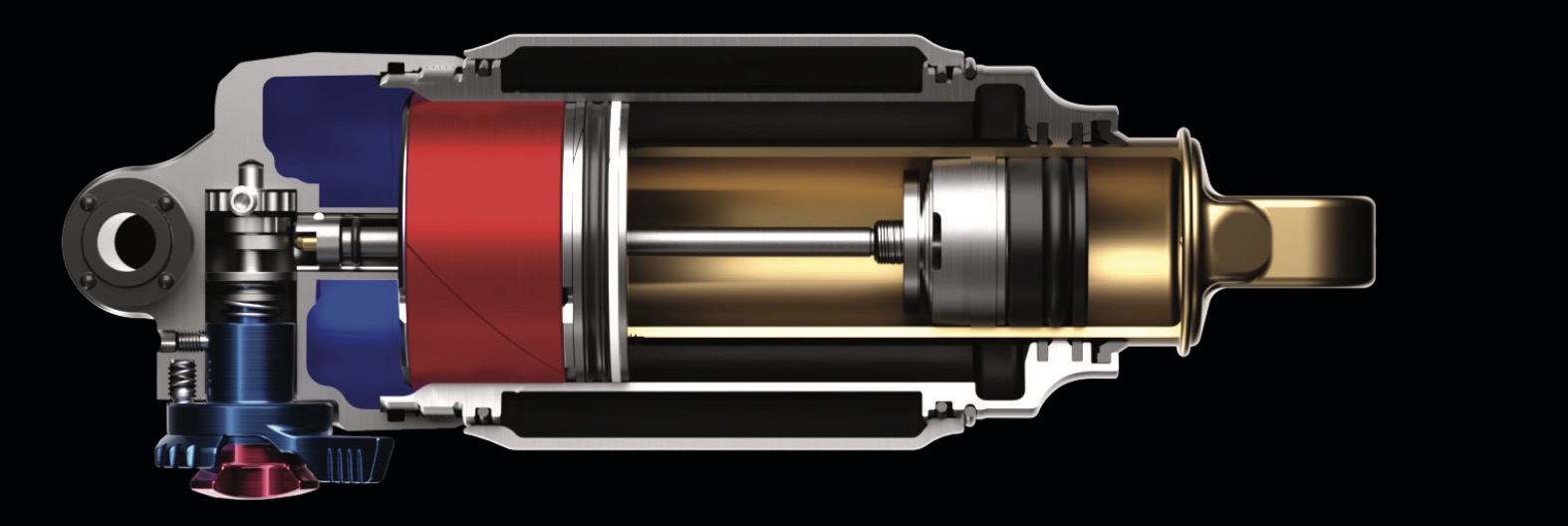 It’s a Fox shock but not as we know it. I shall try and explain it simply because it is actually pretty simple. The GENIE has two positive air chambers (an outer and an inner). For the first 70% of travel, the chambers are connected. Once suspension is compressed deeper than 70%, the ‘GENIE Band’ closes the connection between the two positive air chambers, leaving you just using inner air chamber.