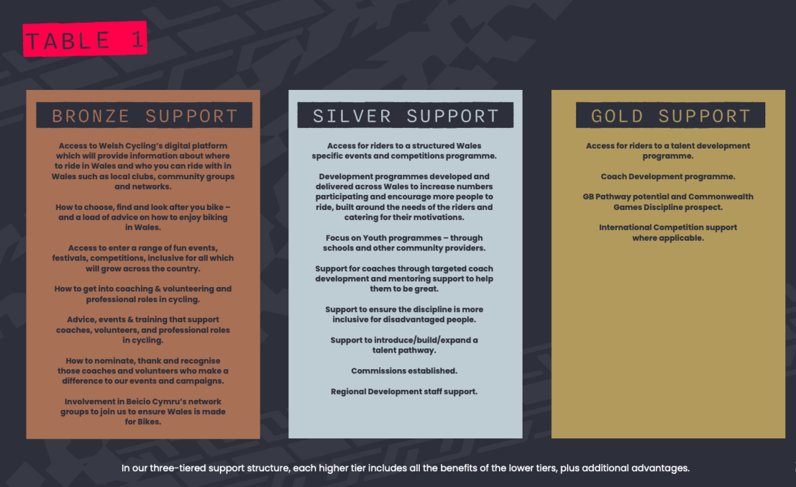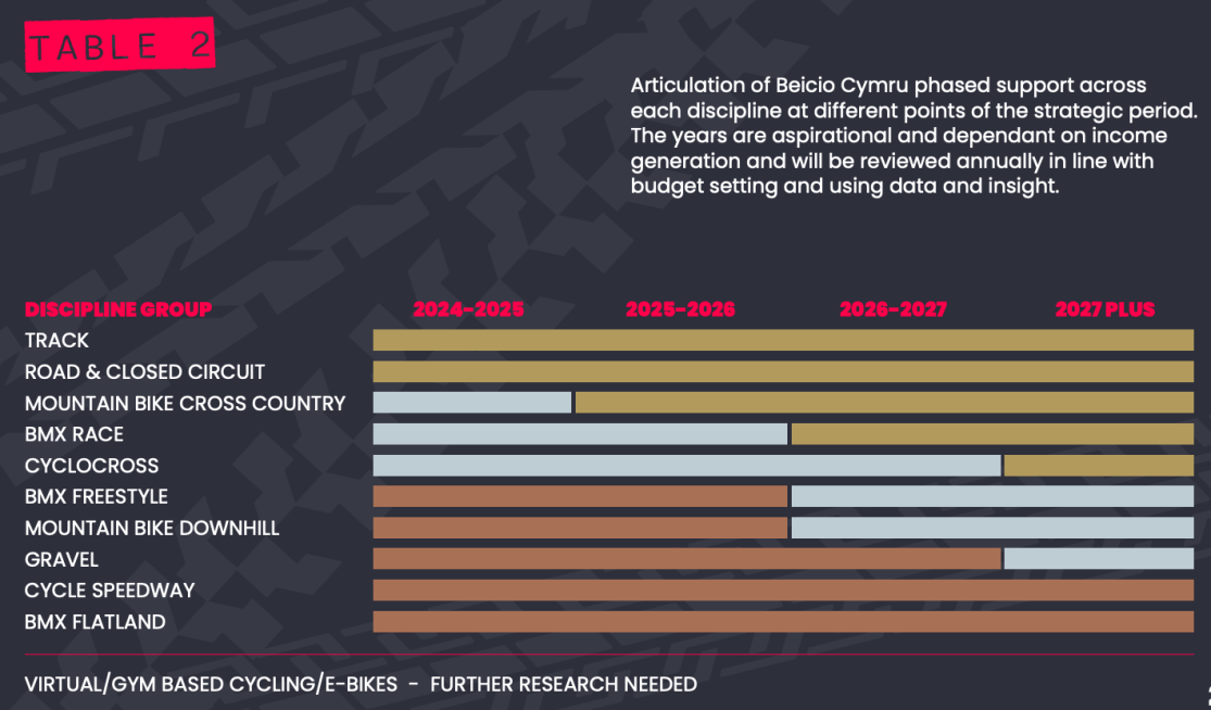 Bronze support appears to be little more than a website portal of ‘here’s stuff you can do’, while Gold support looks like the more meaningful stuff needed to support pro athletes. Gold support would be just the sort of thing needed to take the burgeoning young talent we can see shredding the many bike parks of Wales each weekend on to the world stage… but Gold support is only planned for XCO from 2025, is never in the schedule for Downhill, and Enduro doesn’t even get a mention – despite the fact it’s a UCI sanctioned discipline, and typically a fairly accessible format for the enthusiastic amateur. Track, road and closed circuit cycling gets Gold support though – on the one hand not surprising given so much of the British Olympic Team is made up of Welsh Cyclists, but on the other hand it’s somewhat ironic given that many of them train in Manchester, not the velodrome in Newport.
