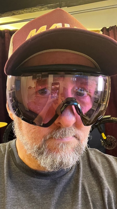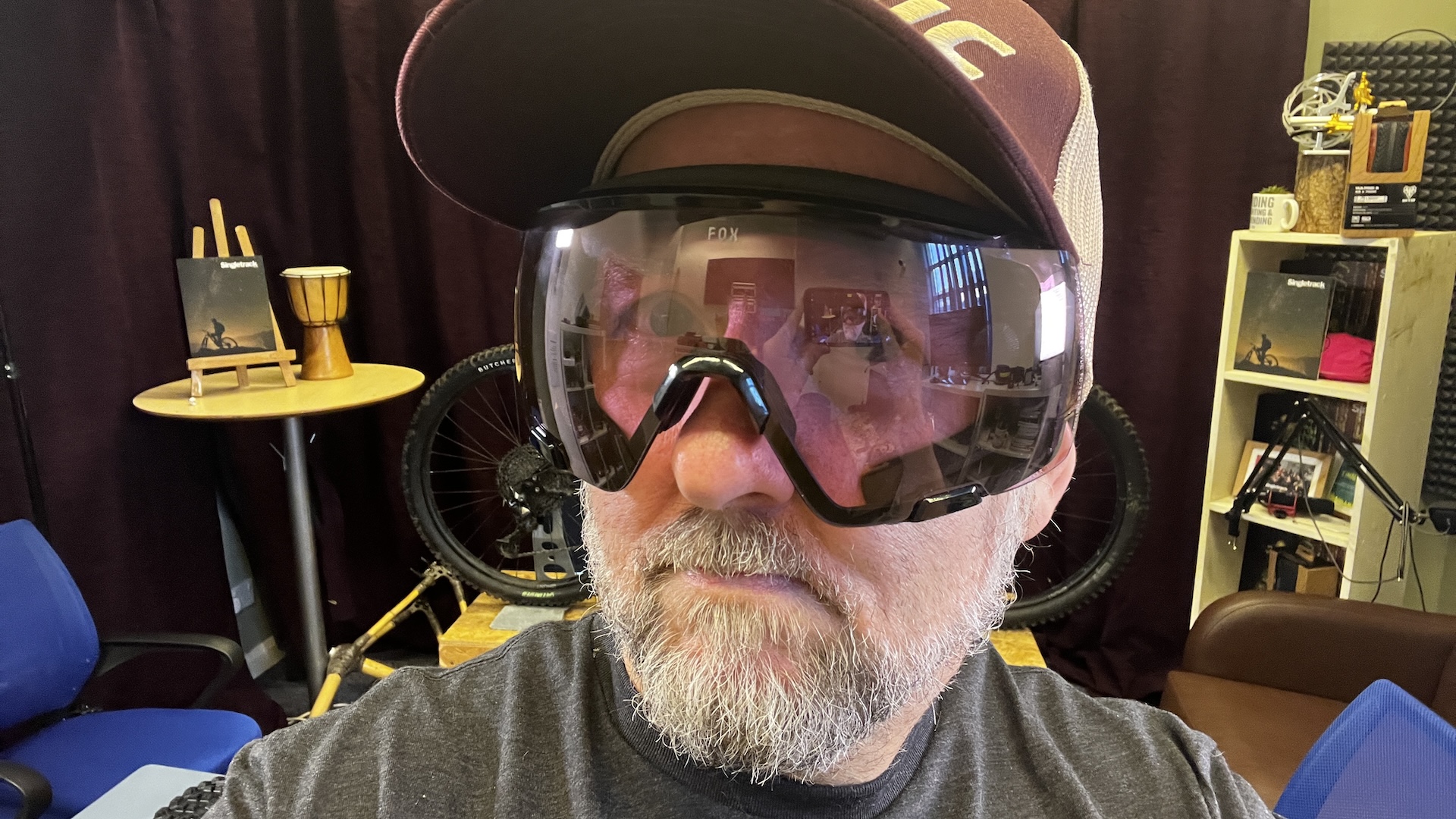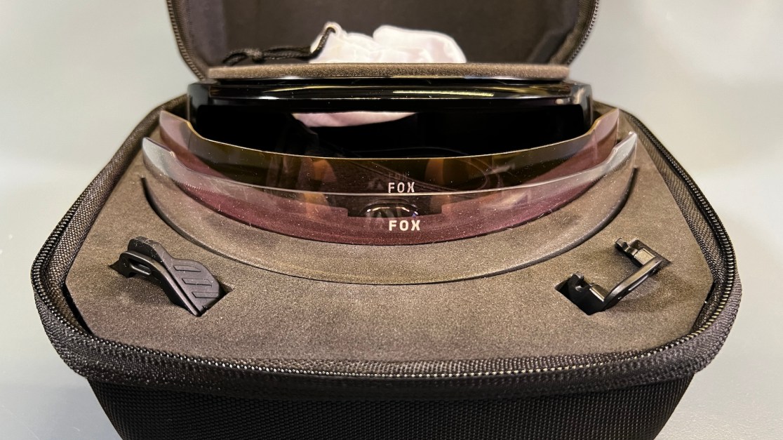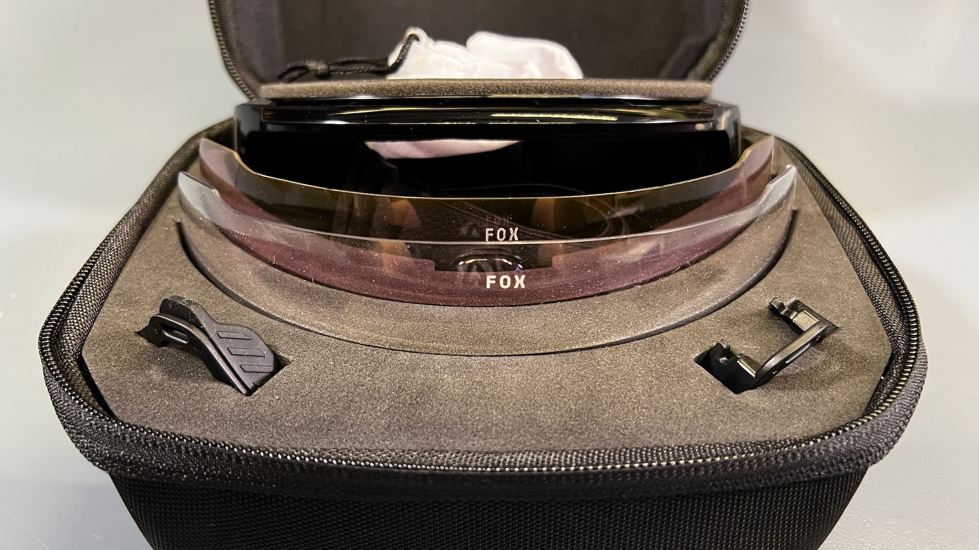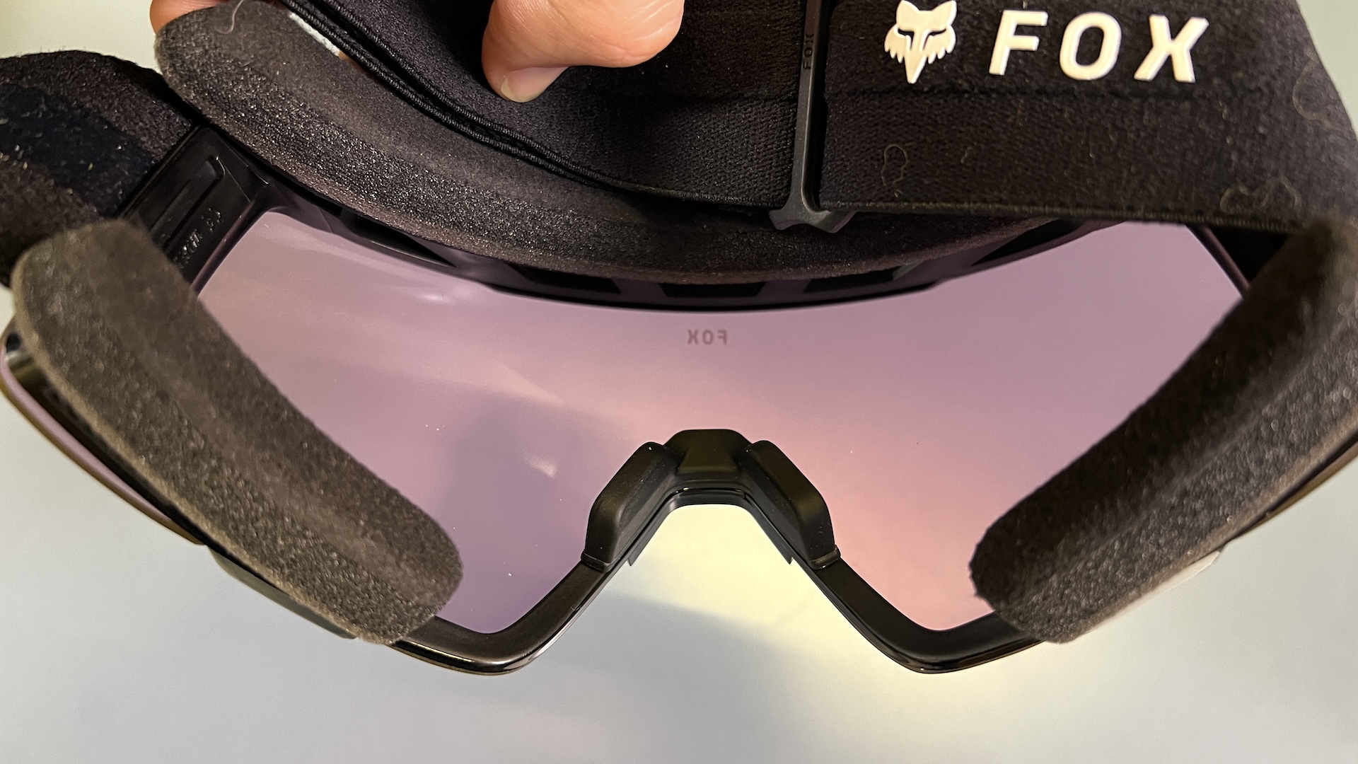 What I do have here in the office are these riding goggle from Fox. Just normal enduro googles they are not. First glances can be deceiving for these goggles are more of a blend of goggle and sun glasses. Goggle up top and around the back but open with a standard nose bridge at the bottom, wot glasses do. The pads lower foam pads sit comfortably on your cheek bones – well they did for me in the office just now. Come with two lenses, in a natty padded case.