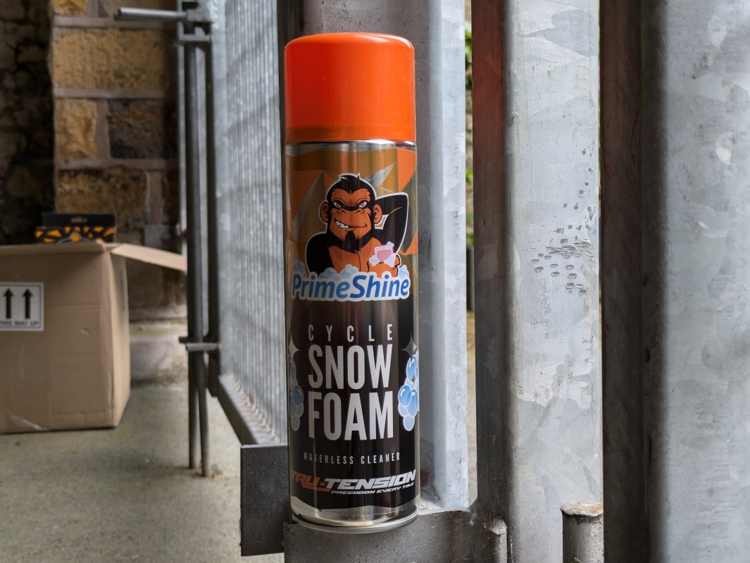 Nope, it’s not that stuff your mum used to spray on the windows at Christmas. This is a tin of magic cleaning foam for your bicycle. Now, I went downstairs to ur workshop to look at this, and the chain brush that follows in order to get a quick grasp of the details and the claims, but they are not in the building. I guess the fact someone has snaffled these and taken them home is a good sign. Whoever has these items will undoubtedly be sharing their thoughts with you in the future.