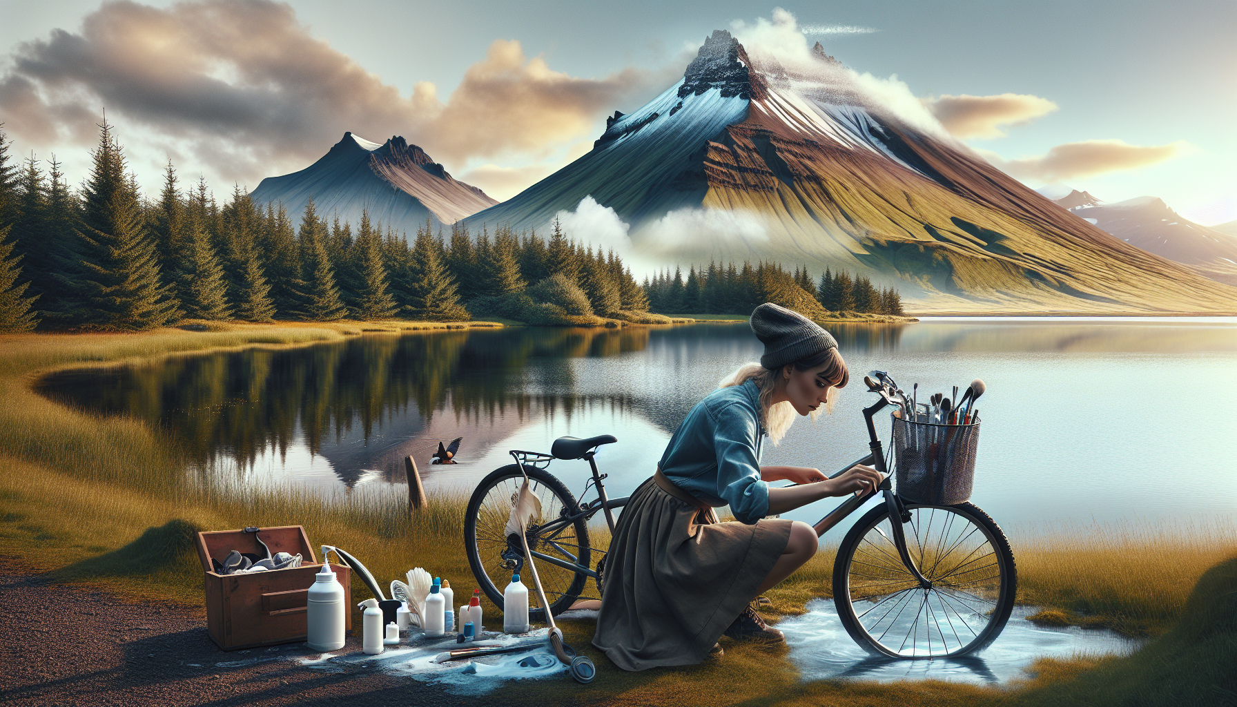 “The icelandic singer Bjork cleaning her bike in Iceland next to a lake with a volcano in the background”