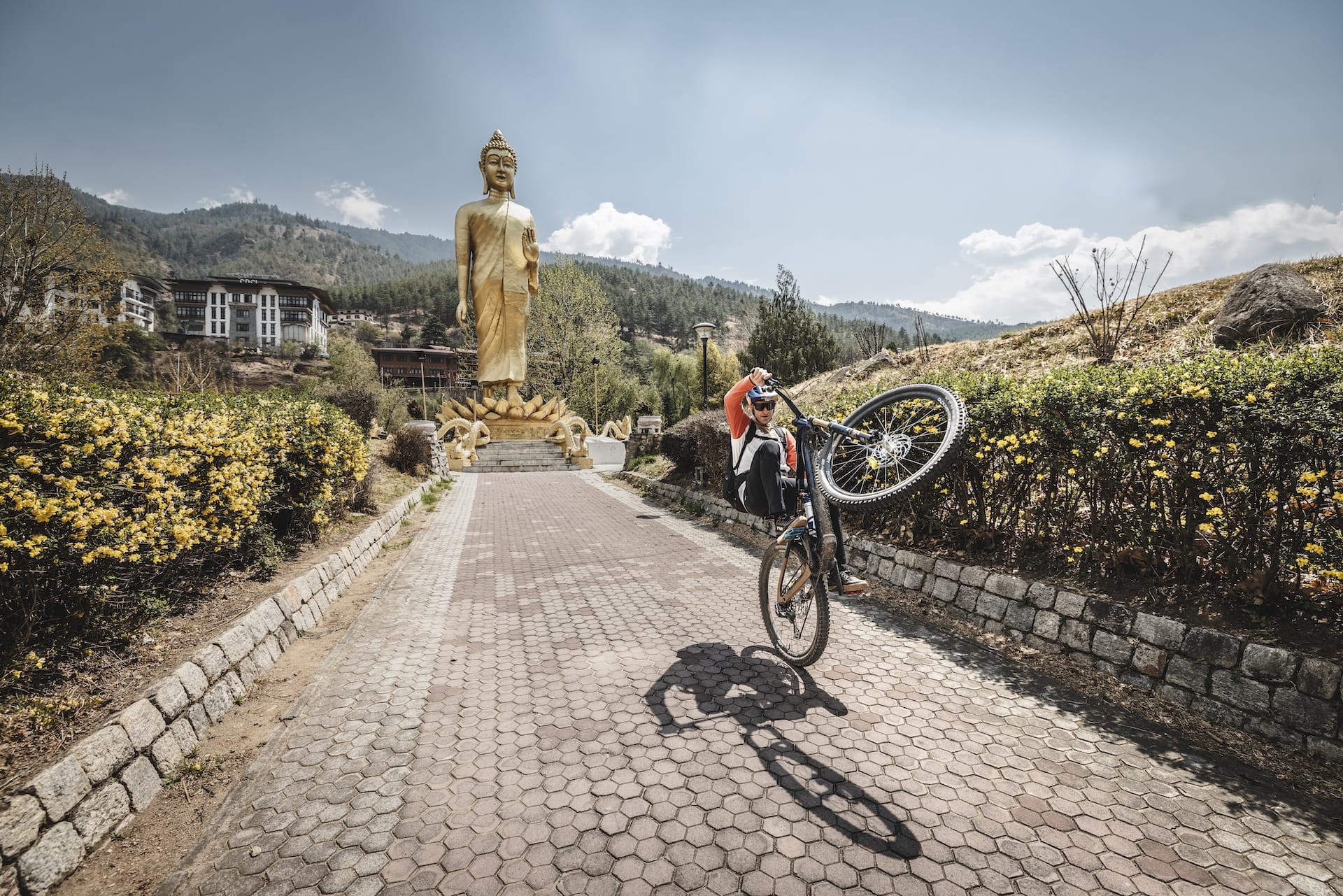 “From here, it’s all downhill, enjoy!” Tandin calls out and pedals off. Tom struggles to keep the rear wheel of the rider in front in sight on the dusty paths, as the local champion knows every inch of the trail. The path is lined with prayer flags fluttering rapidly in the wind. Through a corridor of white, blue, red and yellow flags, the two race into the valley. Suddenly, we round a corner and stand before a temple. A scene like out of a video game – it all looks so unreal. I snap a few photos, but we barely have a moment to catch a breath and move on quickly – there’s not much time before sunset. Before we reach our destination, the urban skatepark, we pass one of the largest sitting Buddha statues in the world, towering over the city and protecting it. Wow, what an introduction to Tandin’s biking world! And for Tom, a good preview of what Bhutan has to offer.