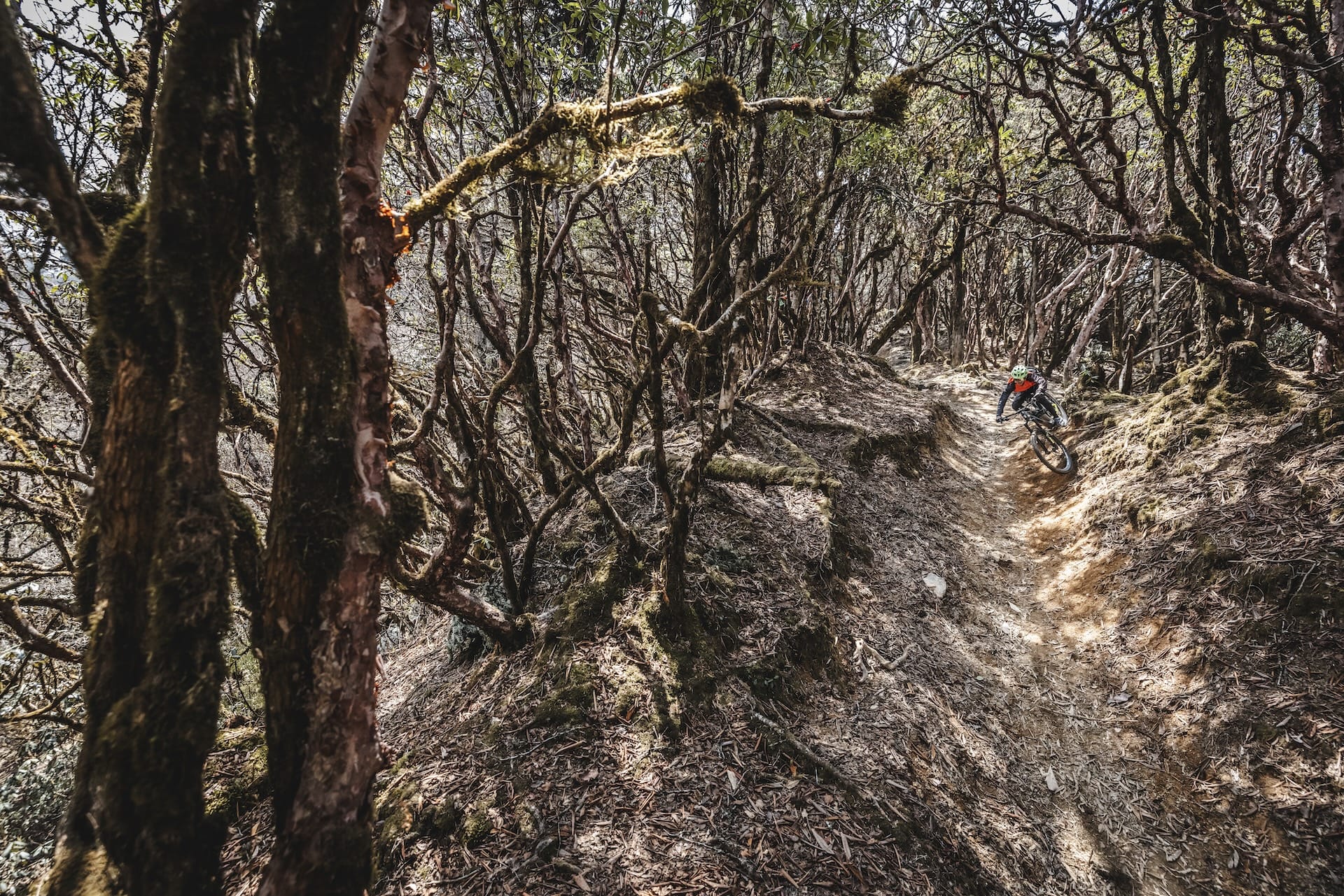 “Here, at 3,500 metres above sea level, starts the Madman Trail. Over 2,000 metres of descent through various vegetation zones await us,” Tandin explains. Until a few years ago, this trail was forgotten. Together with members of the bike club, Tandin rediscovered and made the former footpath rideable. Where the name ‘Madman Trail’ comes from, Tom wants to know. “Don’t worry, I’ll explain later,” Tandin grins, pedals, and flies over the first root sections down to Dochu La Pass.