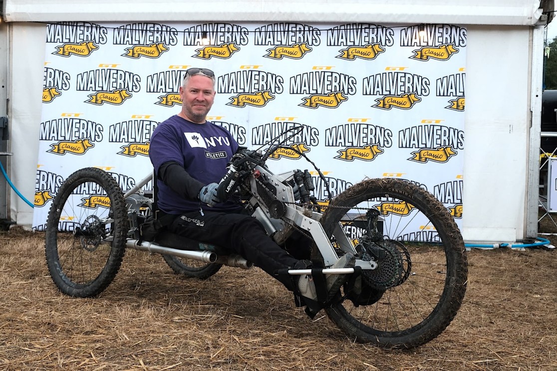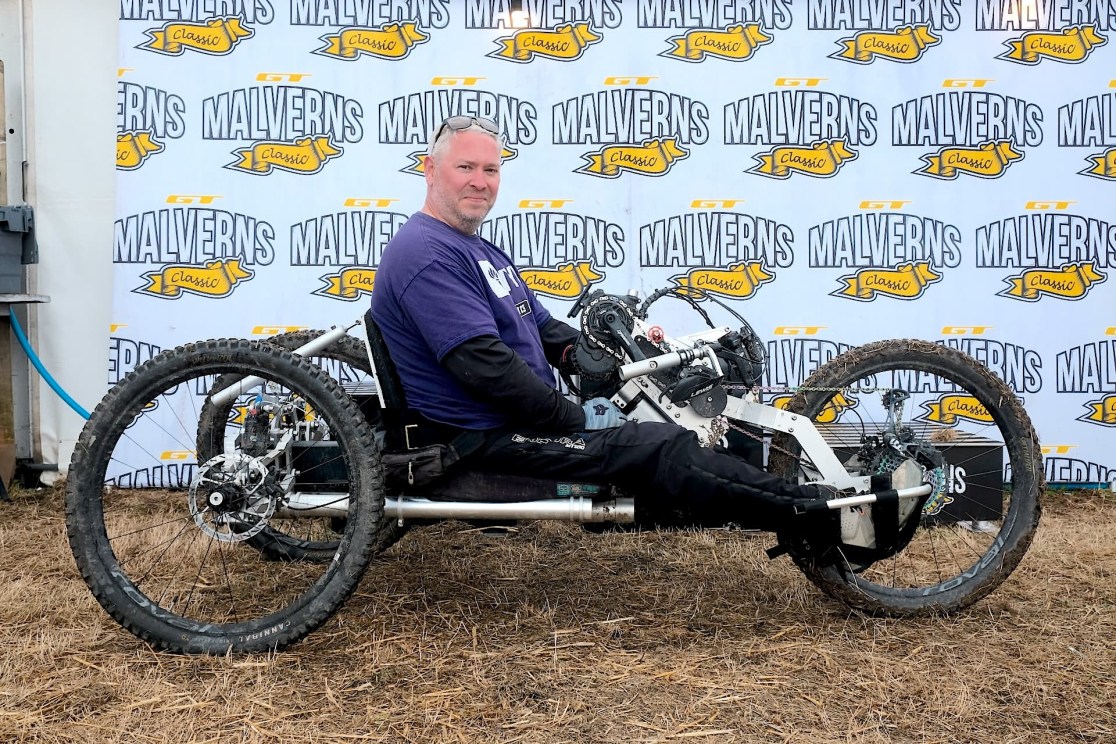 At the Malverns Classic Festival there were a bunch of riders with Bowhead adaptive trikes taking part in the racing, which was great to see. But then this rolled by and I realised it was something really different. And then I got chatting to the guy riding it – Noel Joyce – and discovered it’s some really really different. Quite possibly the most interesting bike I’ve seen this year. Thanks very much to Noel – who is both its rider and its creator – for taking the time to tell me more about it.