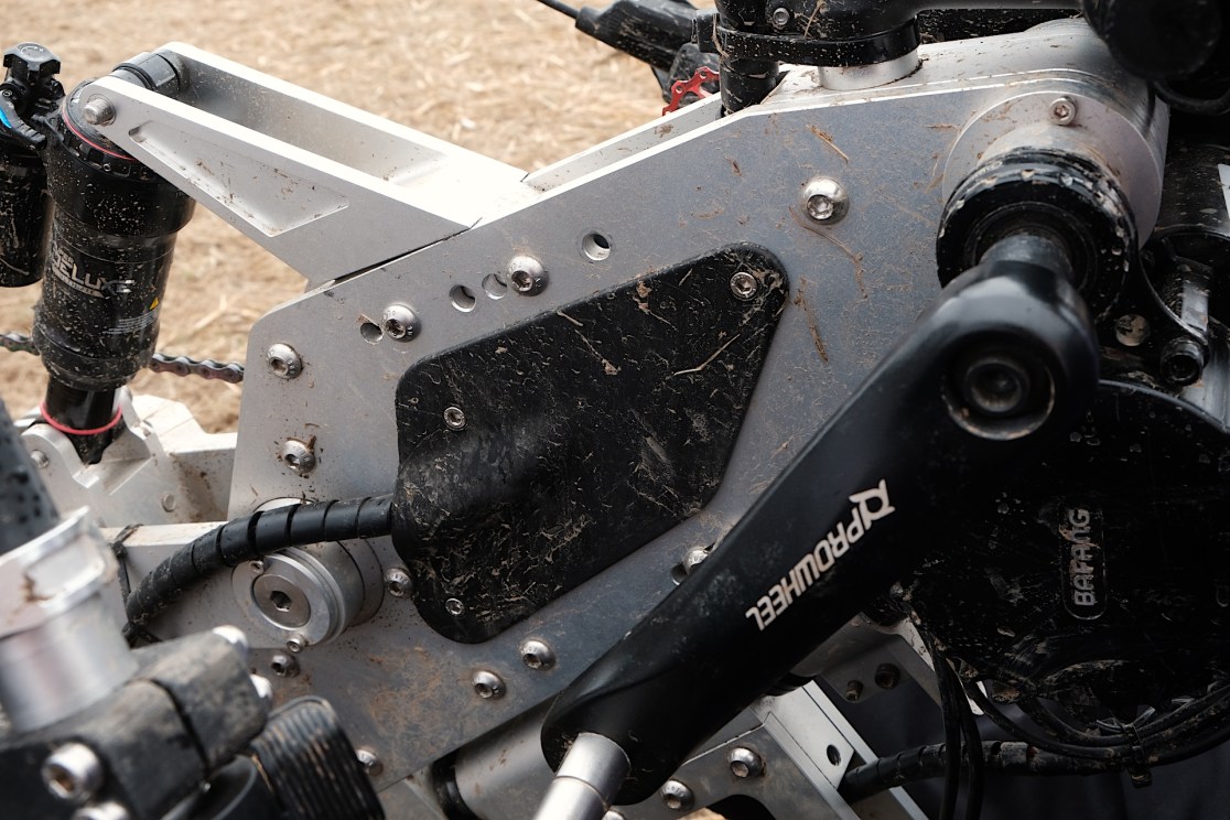 This current one that you’re looking at right now is all 7075 T6 CNC’d aluminium. Everything is machined. It’s all bolted together by standard metric bolts. But the thing is that you can change things on this bike. If you think ‘right I want the head tube to have a steeper angle’, you can change two plates to do that. If you want longer travel in the rear, or shorter travel in the rear, you can do that by changing two plates. We’re thinking it’s almost more like a platform than just a bike. We know that we can start with a rigid version of this ,and build an entire bike for less than 3,000EUR. And then people can actually go from that to a full suspension bike on the same frame by just changing modular components. So it could be very cheap, but like any really good bike you get full works parts and end up with a pretty expensive machine too!