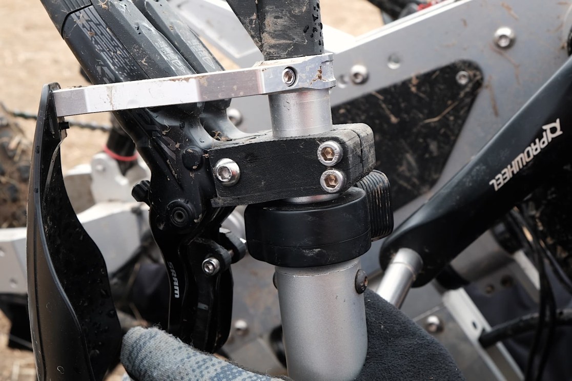 Well the system drive can help a lot with that but I think throttle assistance definitely helps. This actually has the throttle on it as well. But where we see a big advantage with having a modular platform like this is that we’re able to look at someone with a disability and go ‘okay what will work for you?’, and we can start to amend this platform straight away. So for example in Shanghai in China we had a lady who had spinal bifida and much smaller legs and we mounted the foot hoops to the mainframe since she was much smaller, so we were able to set up for her. We were able to, in Idaho, design brake levers to suit individuals with limited dexterity as well. For example on here I’ve 3D printed these parts to make a dual brake lever, rather than a specialist setup with a Hope lever or whatever it might be, that can be quite expensive.