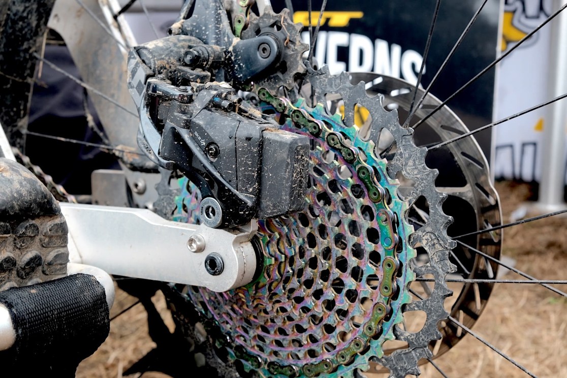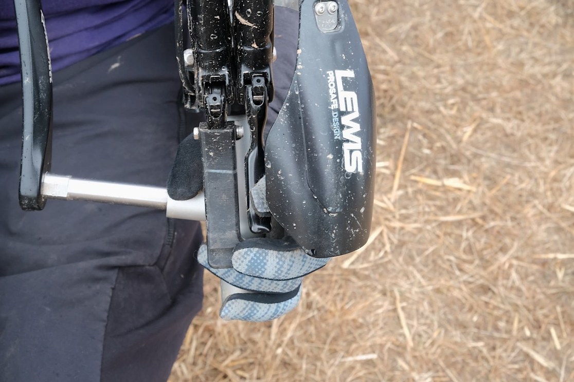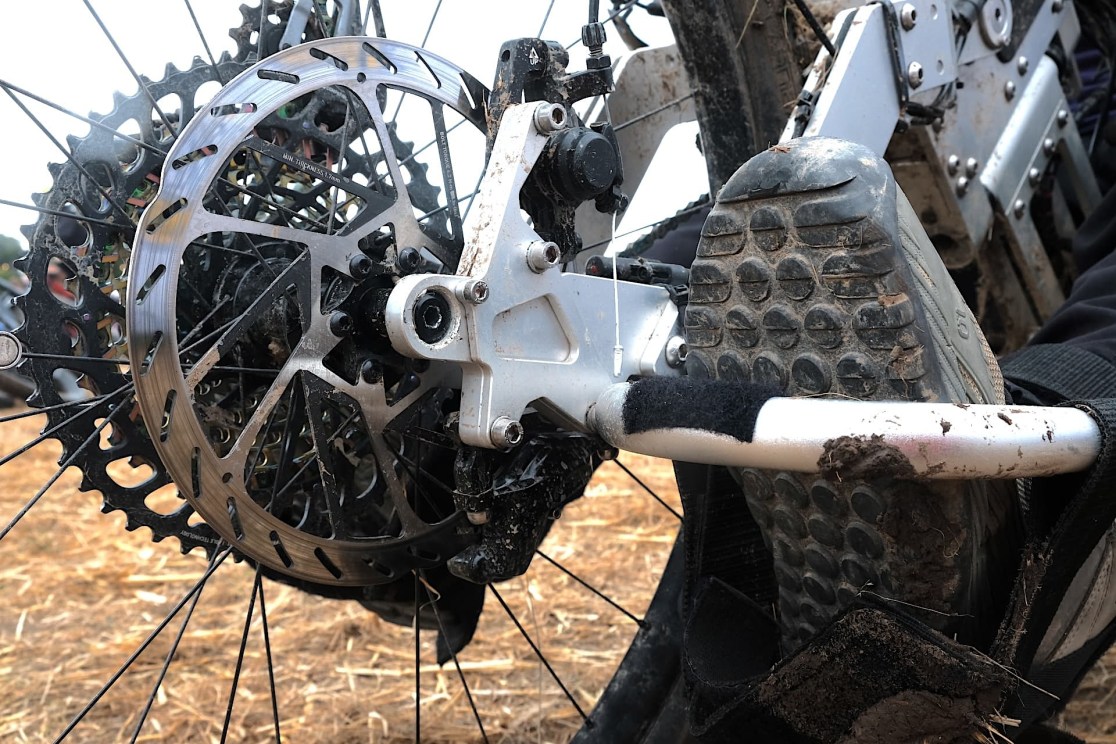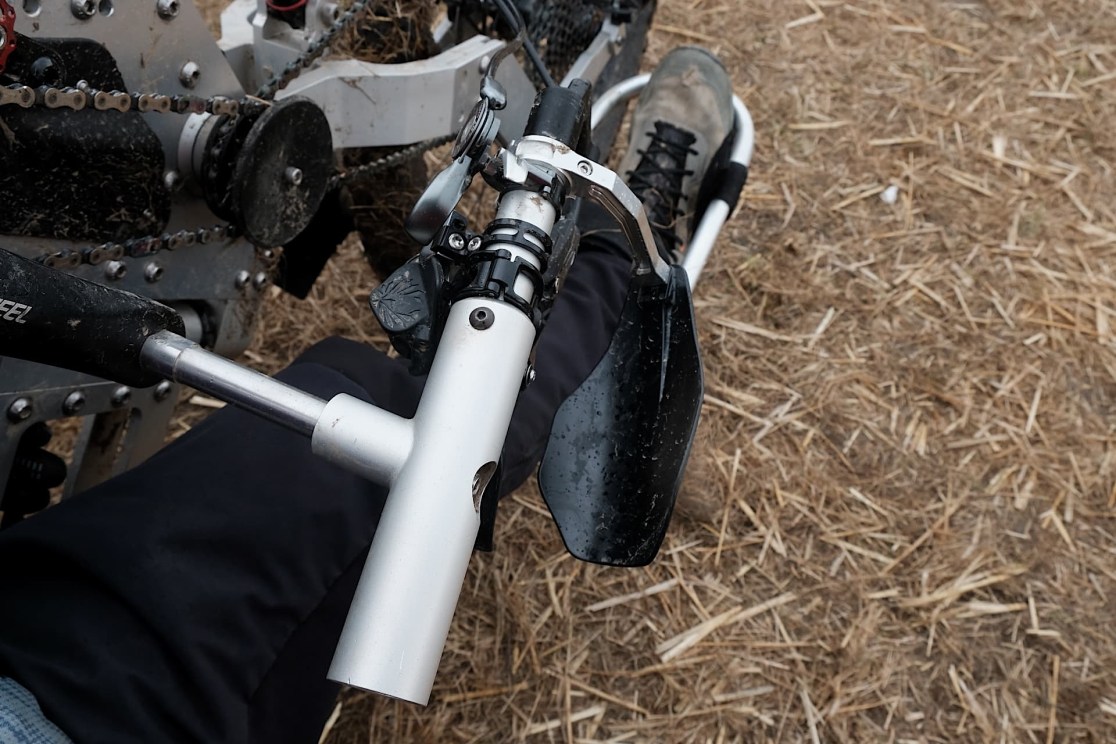 On the other pedal, Noel has an AXS wireless shifter for the gears – which he notes could be moved to be chin operated. He tells me that SRAM has just patented voice activated controls, which will further open up options. Showing there’s no end to his innovativeness, he’s also taken a standard suspension lockout lever system, and turned it into a hand brake – allowing riders to transfer into the bike without it rolling away from them.