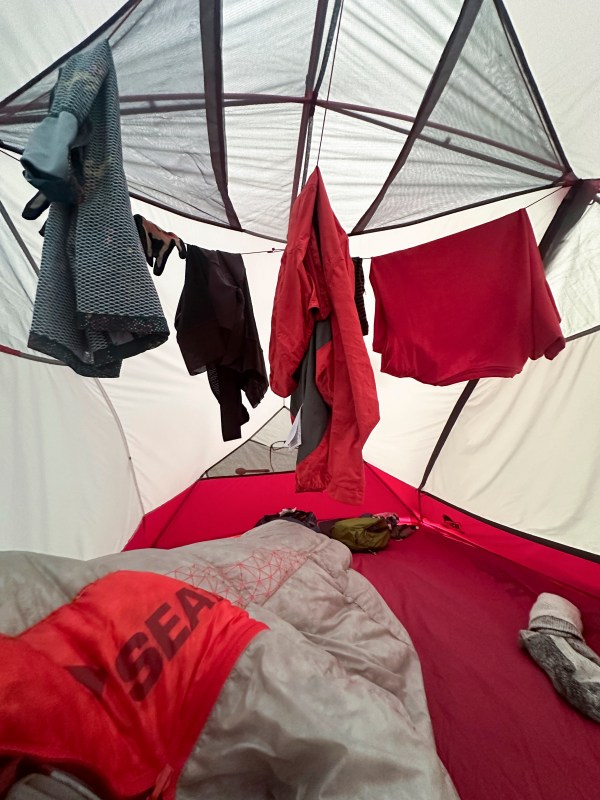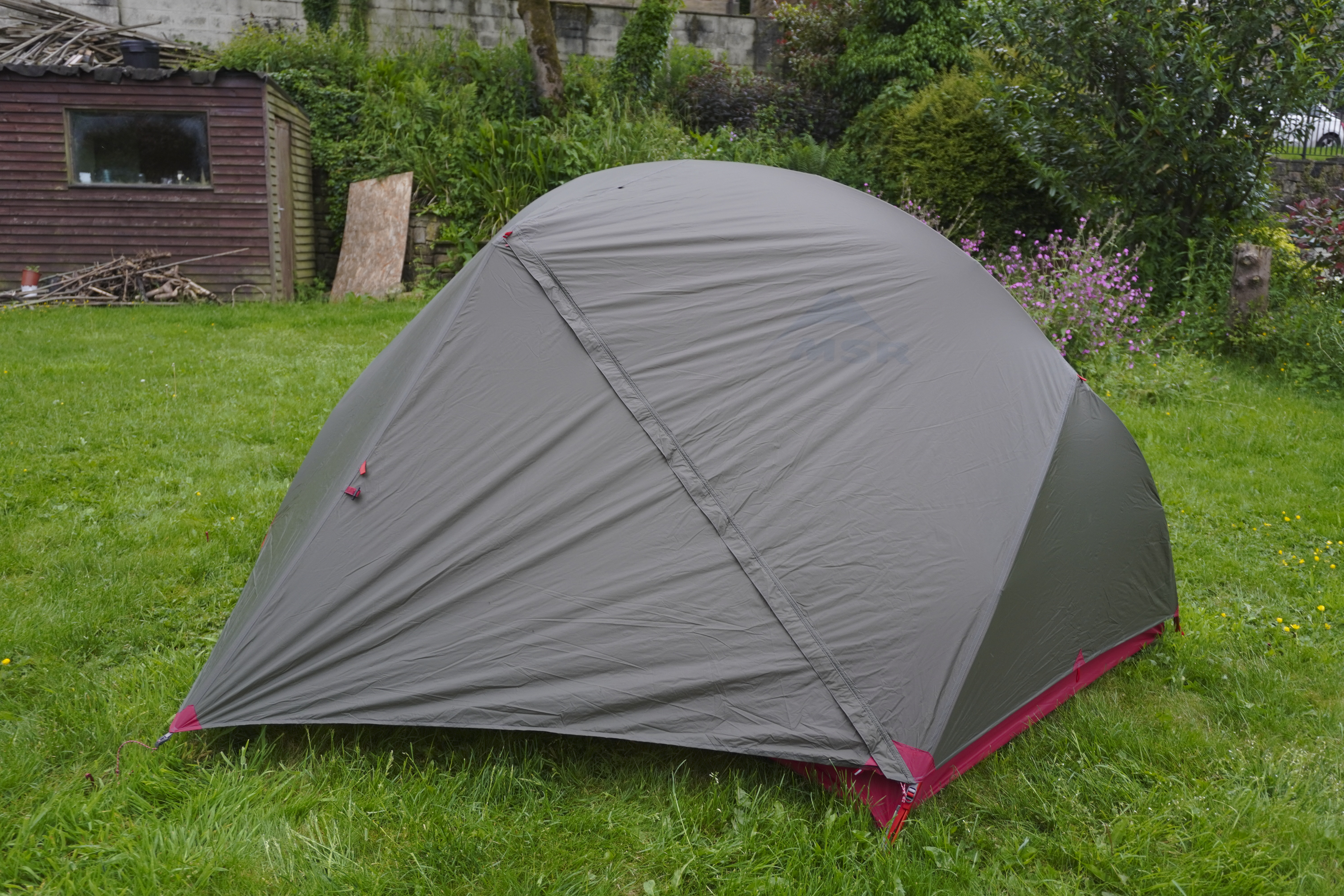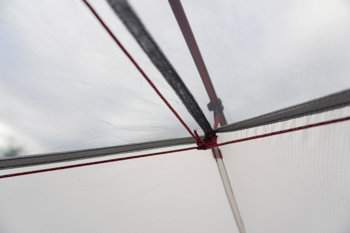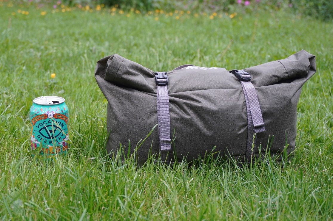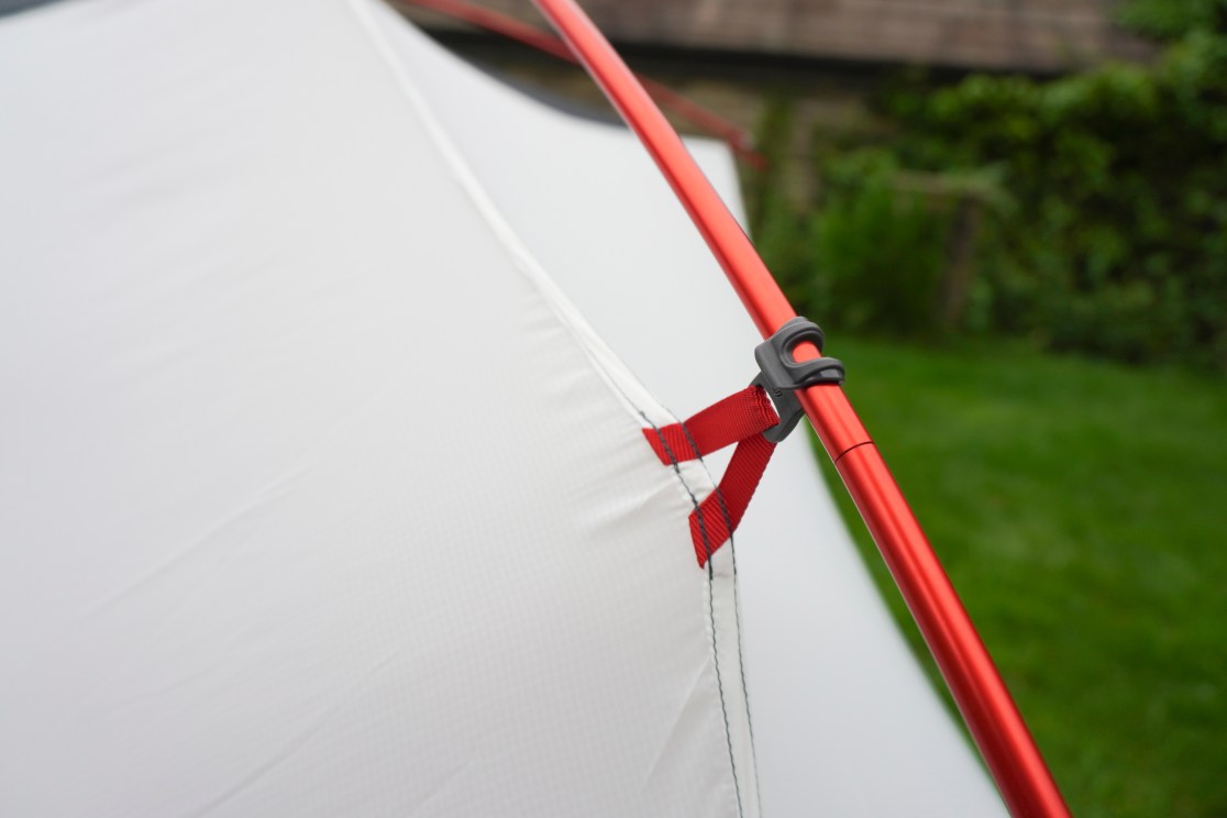 A light, waterproof and compact tent that can be mounted to both flat- and drop-bar bikes. It attaches to the bars with two straps, and there’s an elasticated bungee at the stem to fully secure the bag. The extremely lightweight spacers are removable and are an option for floating the bag away from your bars. The bag itself is waterproof, and there’s enough room inside it to include a footprint if you have one, and any other bits and bobs you may want to put in at the last minute when packing up camp. It’s not a squeeze getting the tent into the bag. The big sell for this tent is that the pole design has shortened the folded dimensions to a mere 30cm in length. Erecting the tent is fast and mostly foolproof, even when doing it alone. The poles are symmetrical and the snap-on hooks to attach the inner tent layer take seconds to pop on. The poles slot easily into the red anodised tabs on each corner of the inner pitch, and the tension system on these ground straps makes it very simple to get the tent up without stretching and forcing poles into place, as you just pull it tight once pitched. Little kickstands for the vents are extremely useful when you’ve hung your riding kit up on the interior clothesline, which is a new feature for this MSR model. This tent has decent headroom and it’s a real treat to have carried such a lightweight and small piece of equipment around to then have it transform into a really usable space. The four internal pockets are tech-friendly and have cable ports in the lower corners of them. Another new feature is the two roof pockets, which offer further organisation or a great place to place a bike light while you’re setting up your bed. Both the external and internal door zippers are smooth enough to use one-handed, and the outer door creates a ‘porch’ to put your shoes and bags in, so they’re sheltered and hidden yet not actually inside the tent. An excellent piece of kit designed to be easy to use while surviving heavy use.