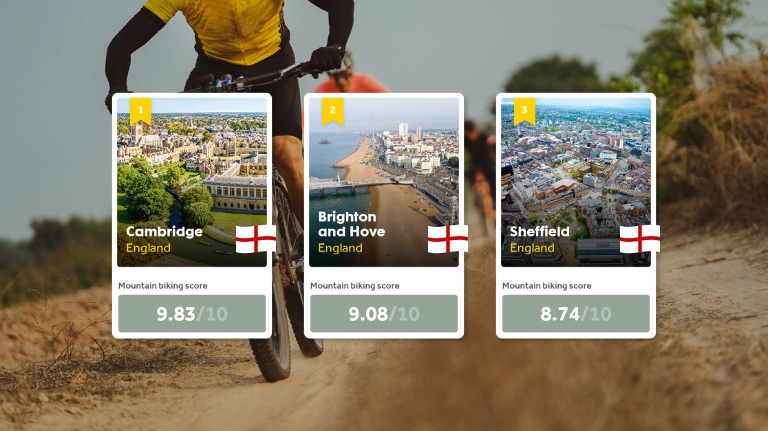 per 100,000 people Percentage of Rank City Mountain biking trails Bike repair shops Average rainfall (mm) Moderately difficult mountain biking trails Hotels rated 4*+ Apartments rated 4*+ Holiday homes rated 4*+ All accommodation rated 4*+ Mountain biking score (/10) 1 Cambridge 6.7 4.0 38.4 90% 42% 19% 33% 27% 9.83 2 Brighton and Hove 9.0 1.6 44.9 55% 39% 28% 46% 31% 9.08 3 Sheffield 8.8 2.3 43.7 53% 41% 12% 29% 21% 8.74 4 York 7.9 1.8 41.3 46% 57% 36% 25% 40% 8.49 5 Manchester 5.1 1.9 55.8 55% 48% 26% 15% 24% 8.29 6 Reading 5.8 1.9 43.1 47% 55% 20% 33% 35% 8.27 7 Derby 9.8 1.5 44.3 46% 35% 37% 38% 28% 8.03 8 Edinburgh 4.3 1.4 50.1 52% 61% 40% 50% 39% 7.92 9 Belfast 3.3 1.5 62.6 55% 62% 32% 33% 32% 7.89 10 Swindon 6.7 1.0 46.3 54% 40% 27% 20% 29% 7.80