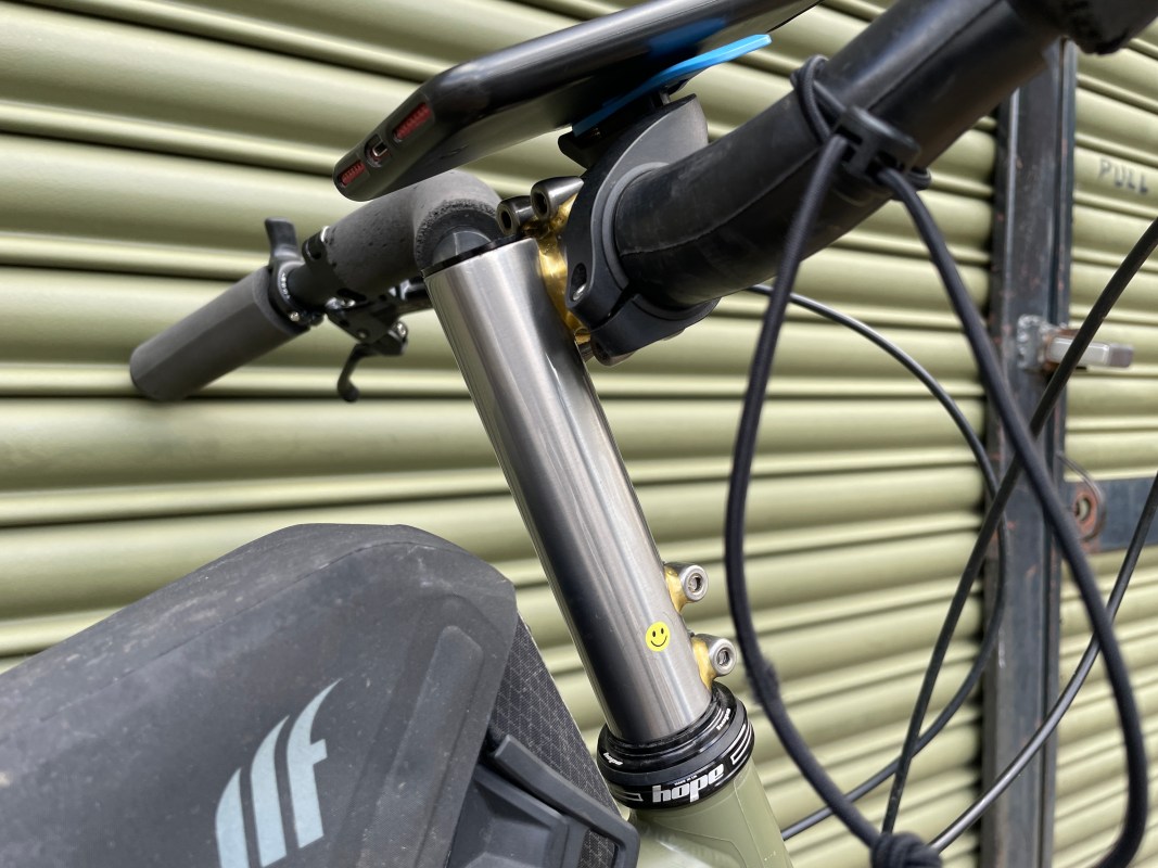This Discord Chromo Peeper stem adds a whole pile of stack – 125mm of it – on a short stem. James say this puts him where he wants to be, particularly on steep descents. And before you think it looks mad, check this out: