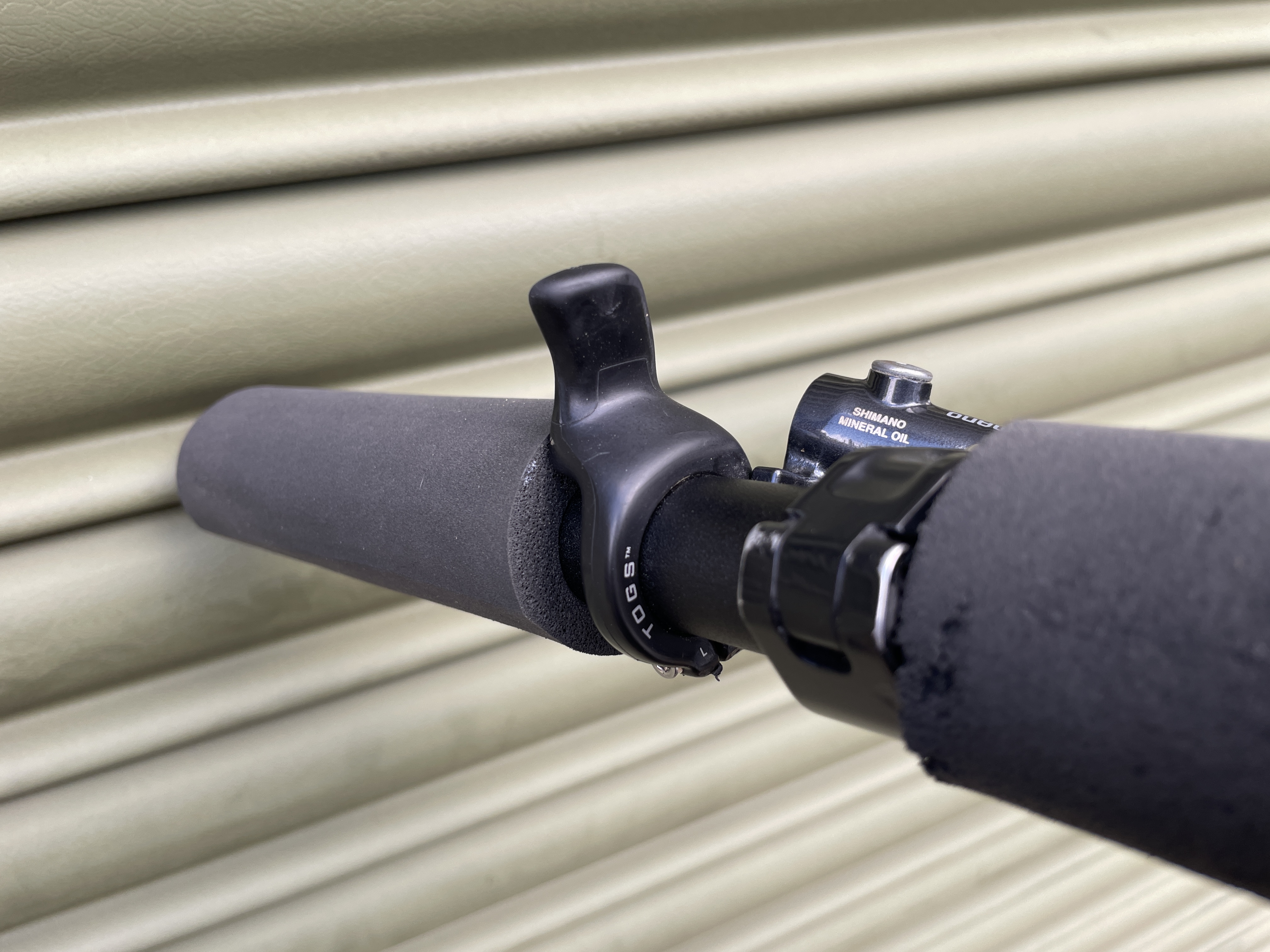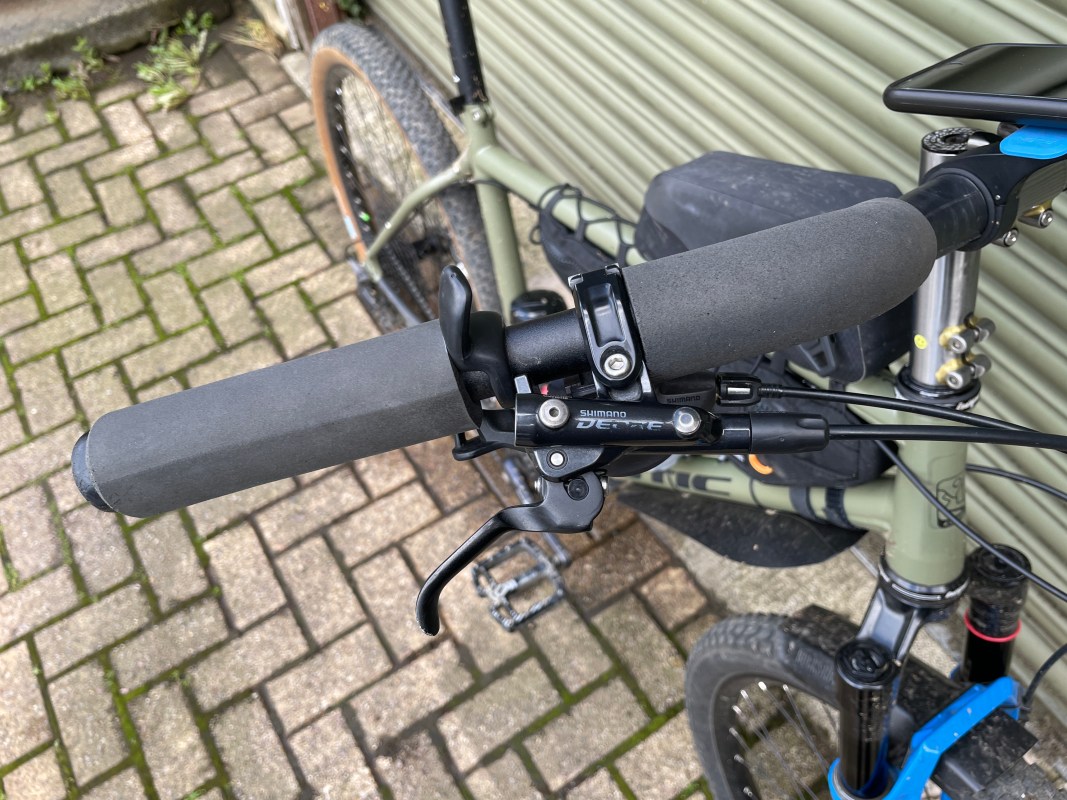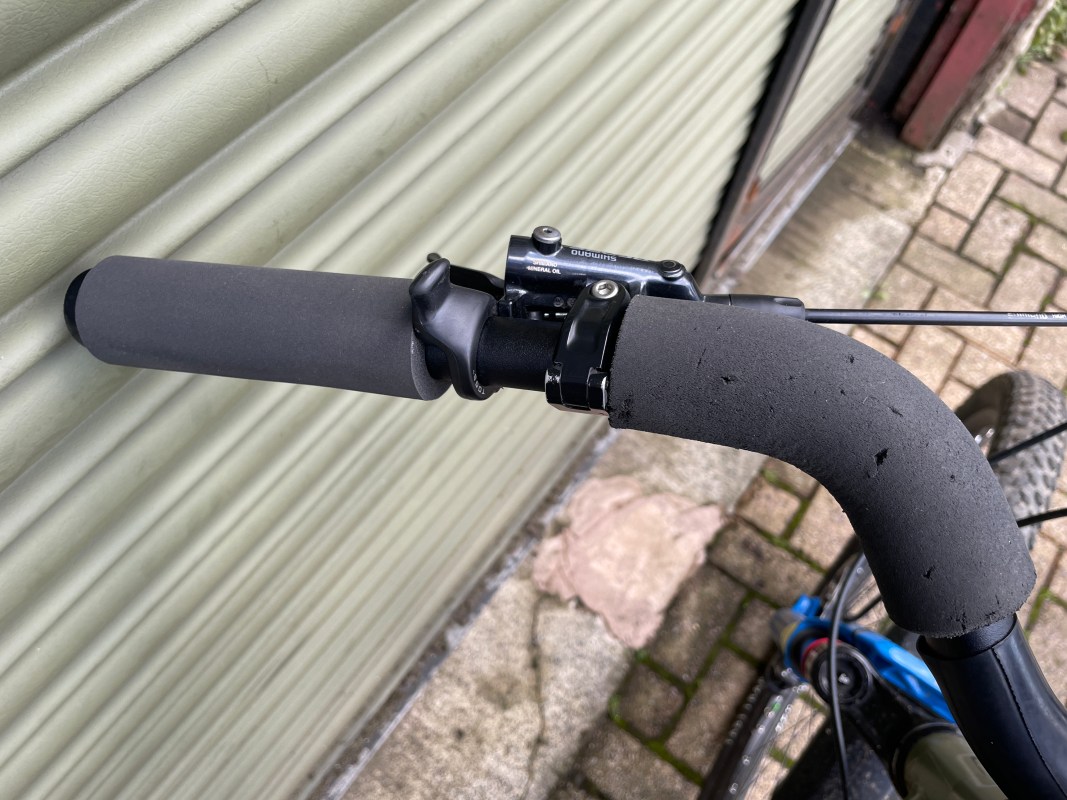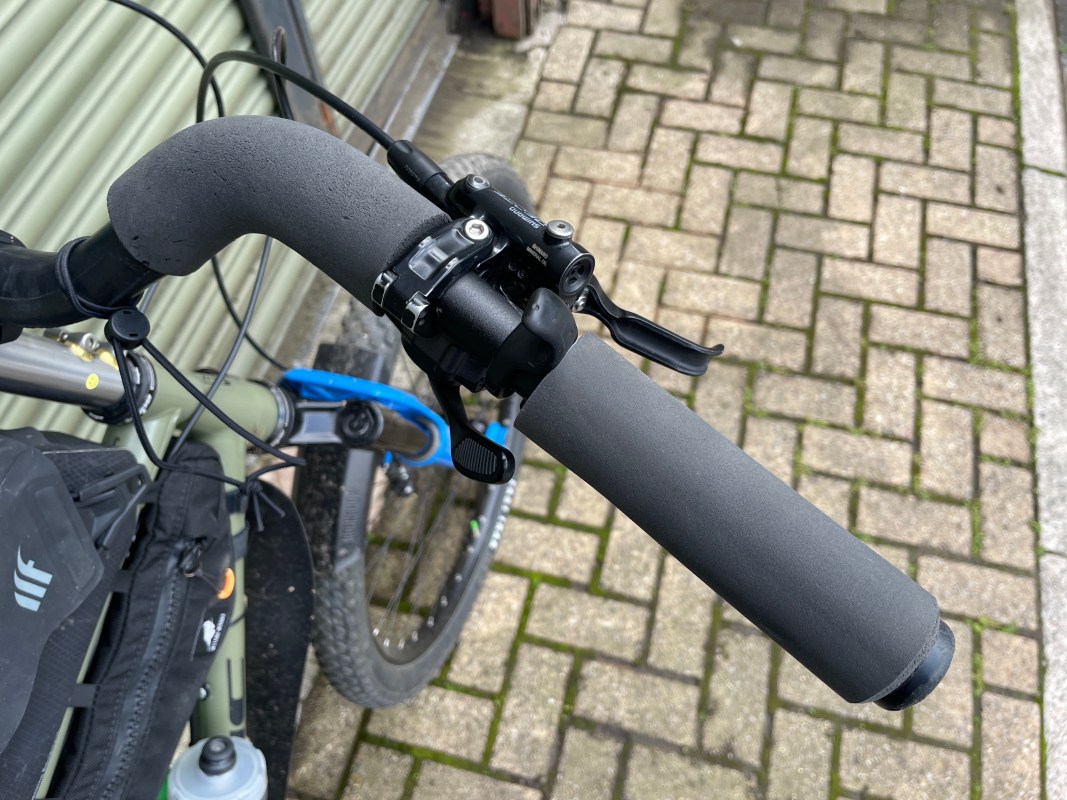 James wanted a range of different hand positions to ease fatigue on long rides, so he’s got foam grips in two different places, plus these Togs, which allow you to move your thumbs so you’re still holding on and in control, but giving your hands a slight shift in position. A change is as good as a rest and all that.