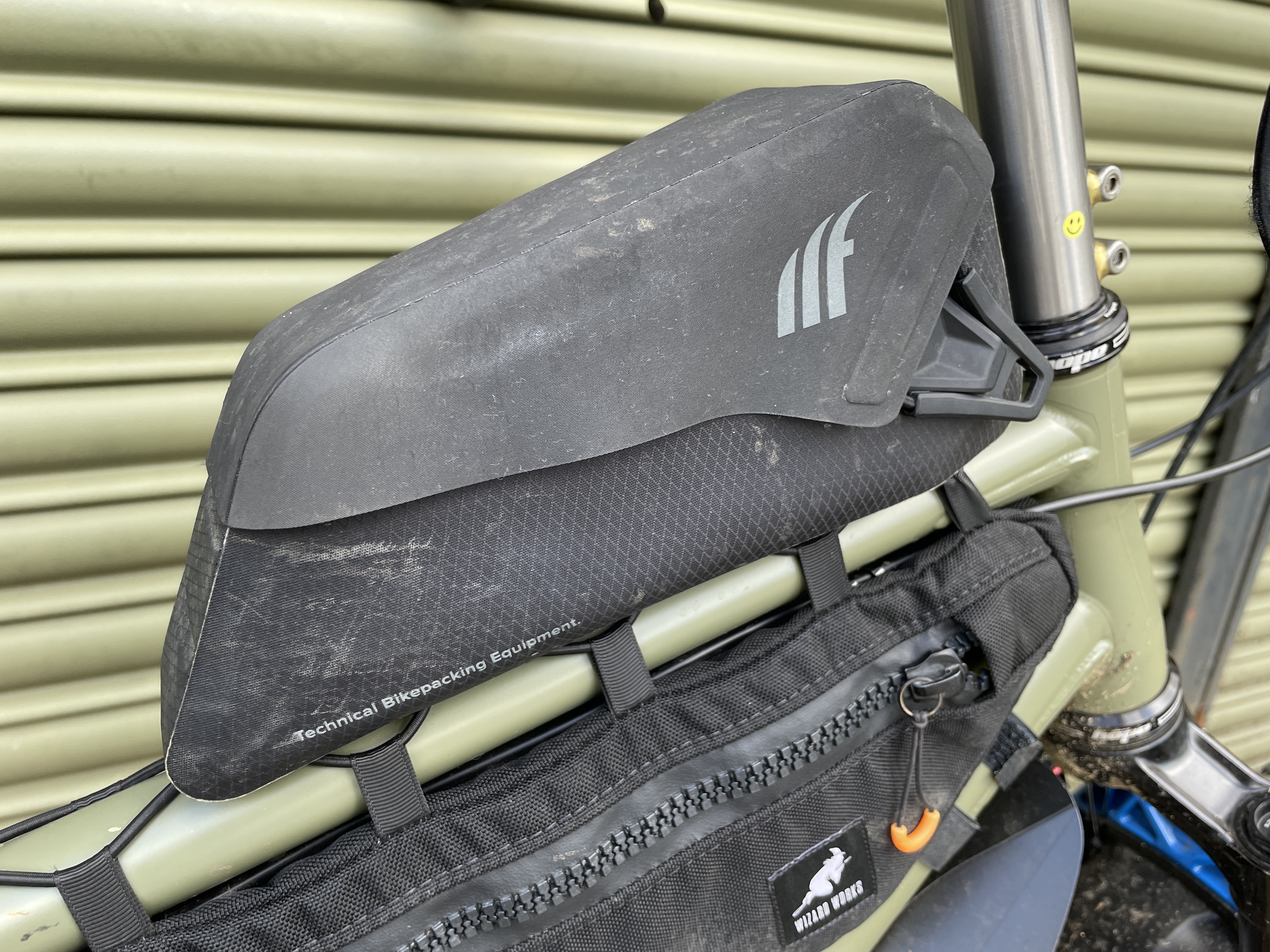 He’s also got a top tube box from Tailfin – handy for snacks – and a Wizard Works frame bag.