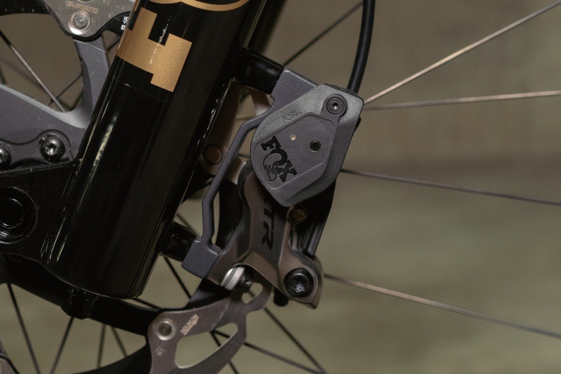 The fork sensor is mounted to the front brake caliper. Using a built-in accelerometer, it detects the angle of terrain you and the bump force.