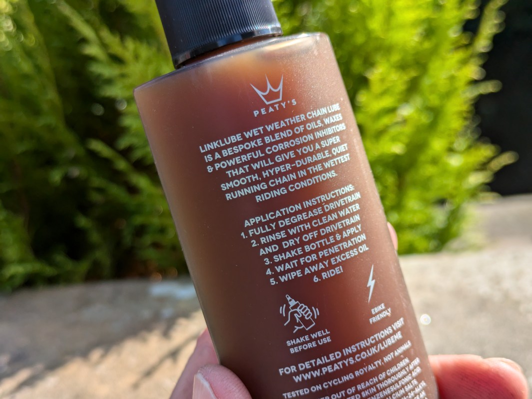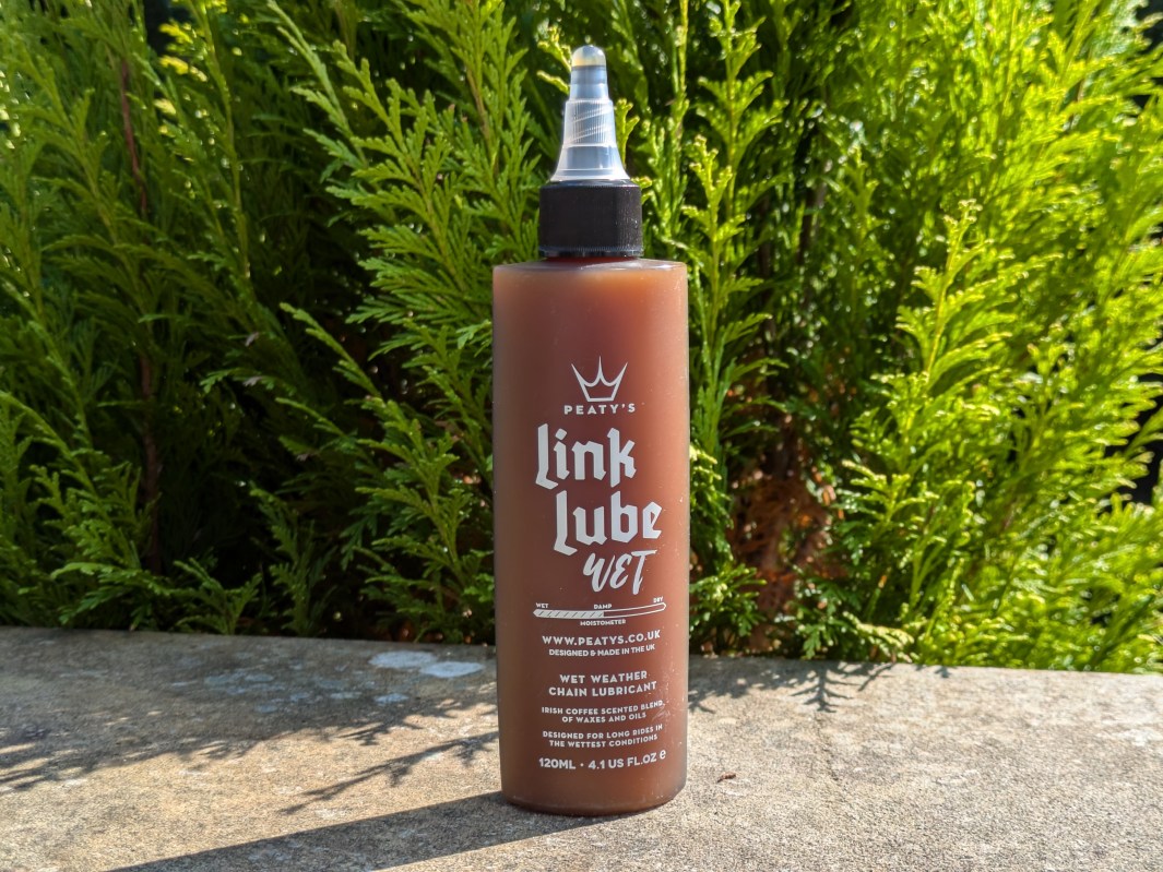 Time to try a new wet lube. LinkLube Wet is “a higher viscosity blend of waxes and oils with a higher concentration of waxes and corrosion inhibitors” than Peaty’s All Weather stuff. Biodegradable. Irish coffee scented(!) Designed for long rides in wet, filthy conditions. Which is what we’ll be doing for the next four months. First thoughts: the nozzle is really excellent. Good flow, accurate, mess-free, easy to operate, integrated.