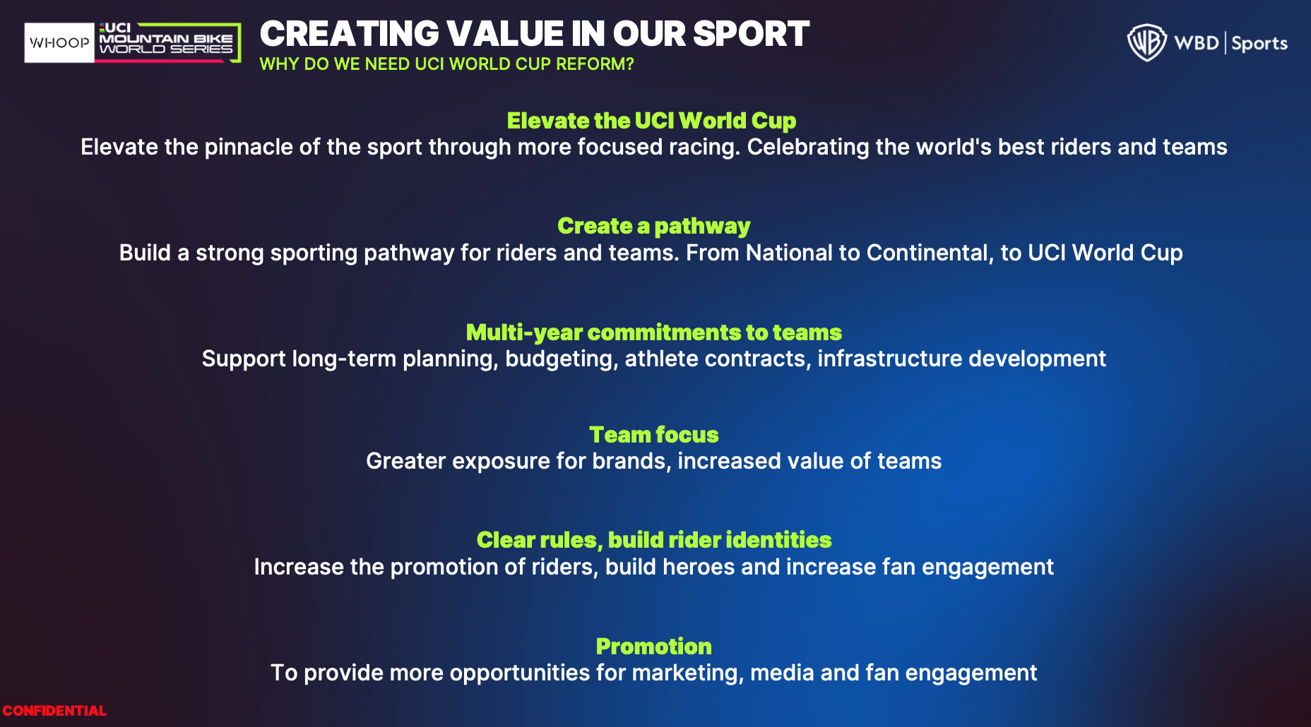 - Elevate the UCI World Cup – Elevate the pinnacle of the sport through more focused racing. Celebrating the world’s best riders and teams