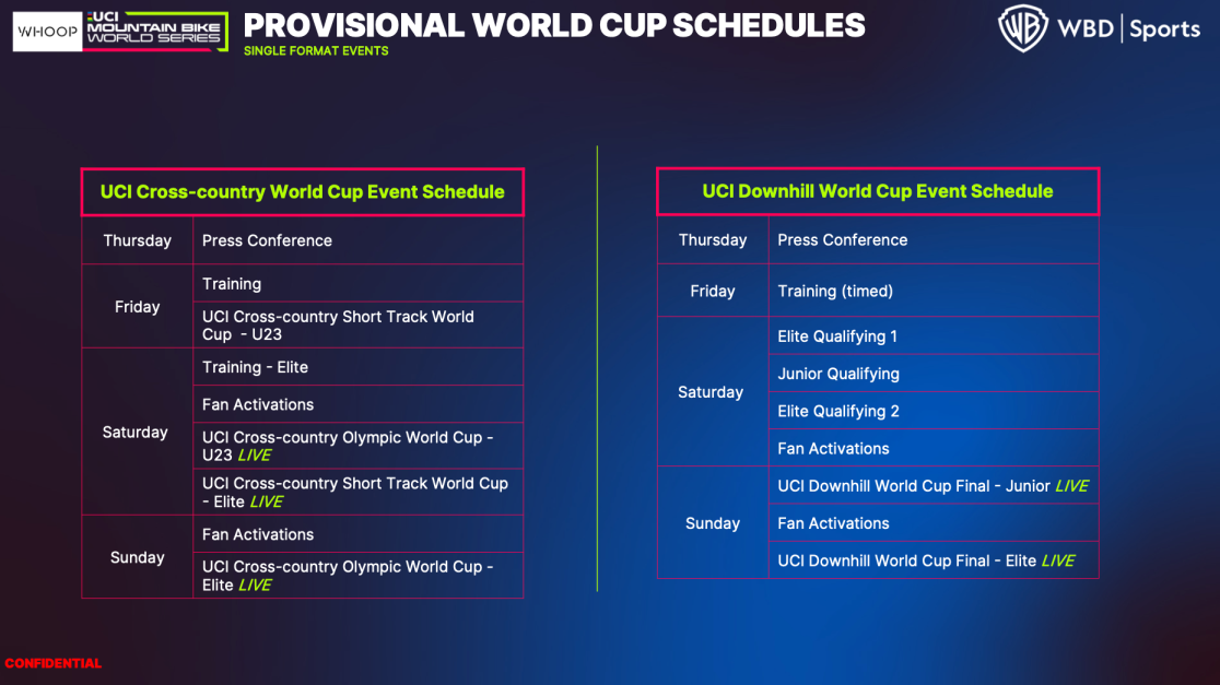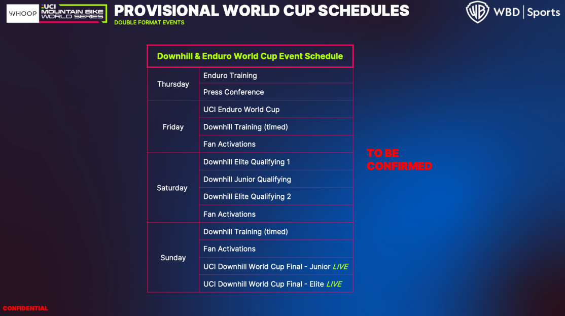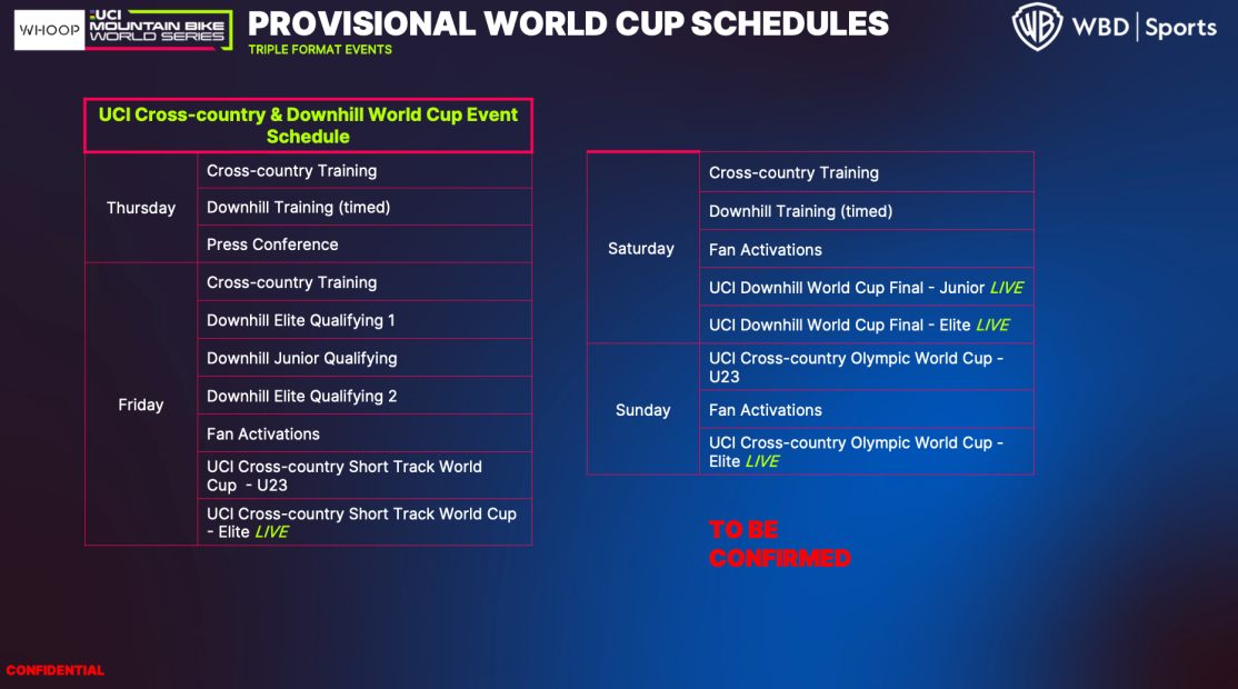 Broadcasting seems to be a bit of a mixed bag. On the one hand, Juniors and Elites will get live broadcasts for most of the races, but the U23 XC events won’t be broadcast when the weekend is also hosting DH. It’s only Finals being broadcast, with no mention of any coverage for qualifications, or enduro.