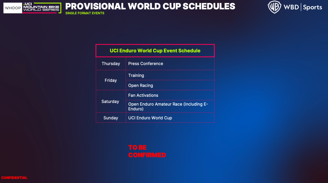 It appears that there are plans to tighten up the categories, with 0-100mm travel being XC, Enduro being restricted to 140-160mm, and DH being 180mm and up. At least, we think that’s what’s being suggested – it’s not completely clear if it will be a UCI-style technical restriction, or just that courses will be designed with these types of bikes in mind. E-Enduro’s World Cup is to be ‘paused’, although it appears that the E-Enduro World Series may continue.