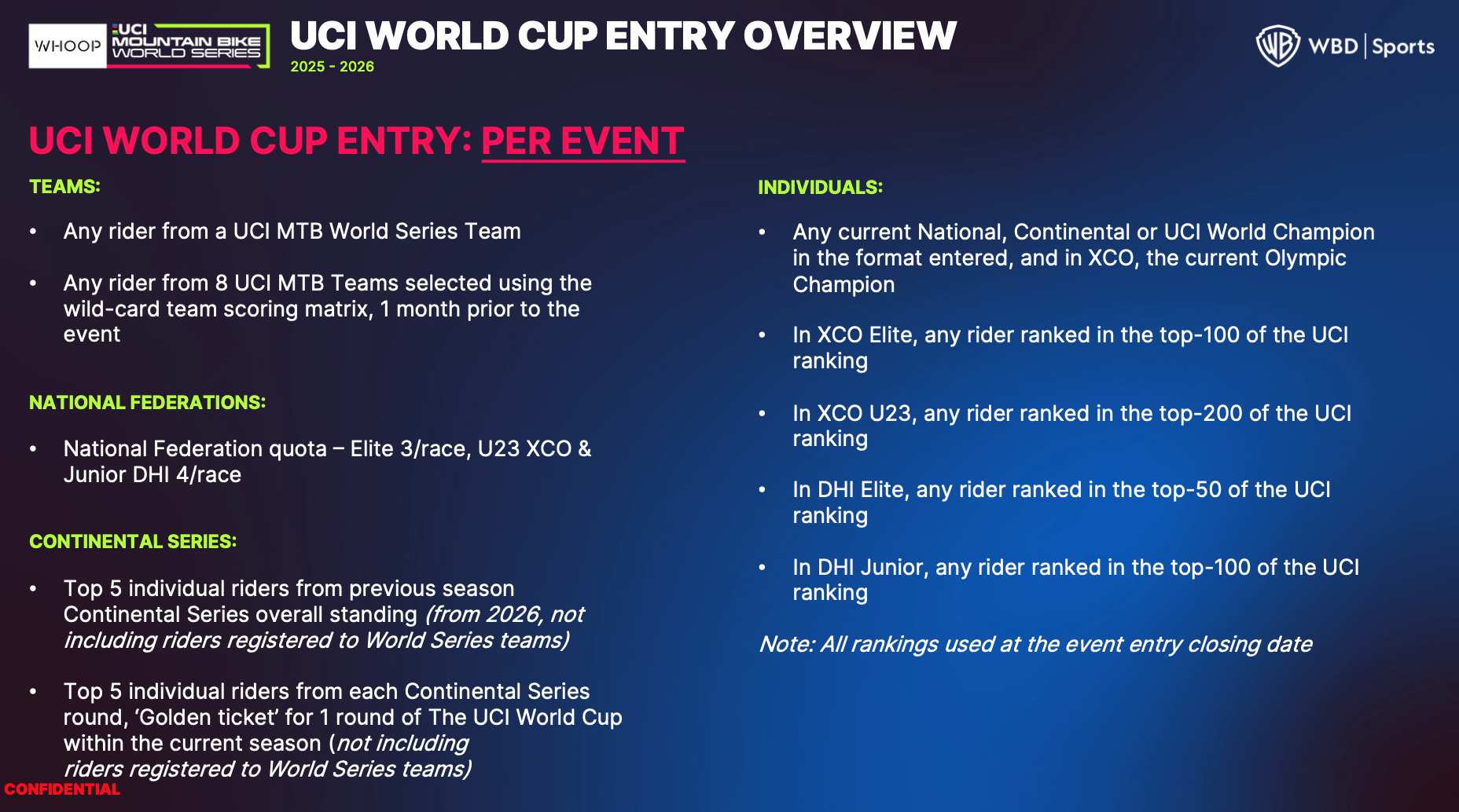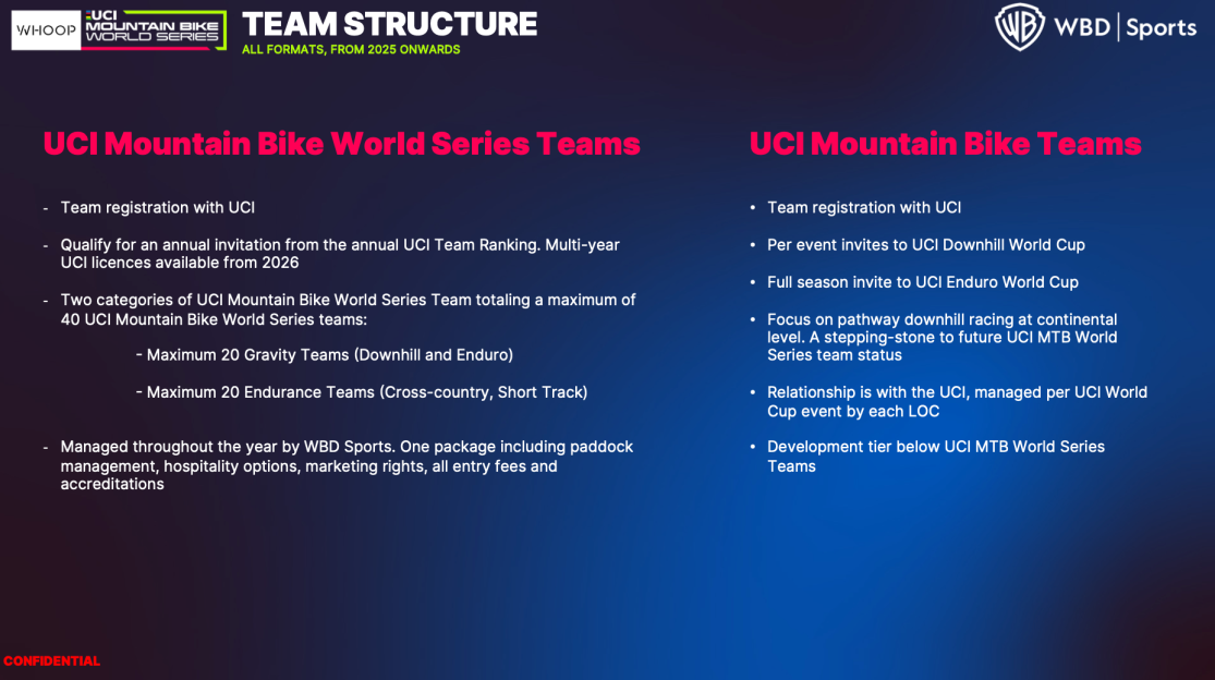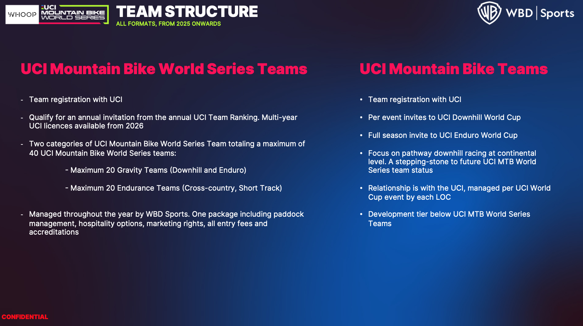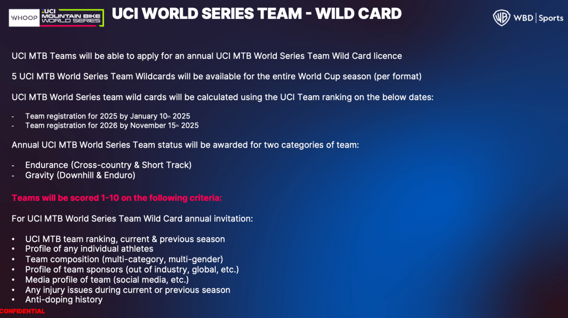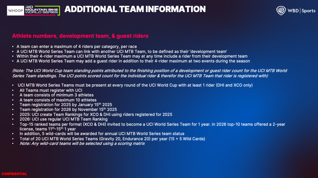 There will also be ‘UCI Mountain Bike Teams’ who can apply to be in the wildcard pool for individual events. These are pitched as a sort of ‘development team’ for the World Series Teams, and teams will be able to partner up. The UCI Mountain Bike Teams will not get guaranteed entry to races, and will have more limited race-side perks.