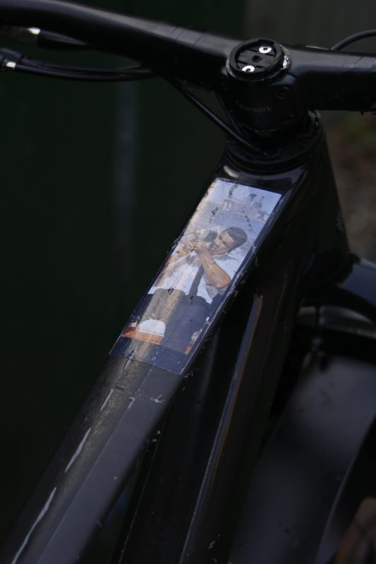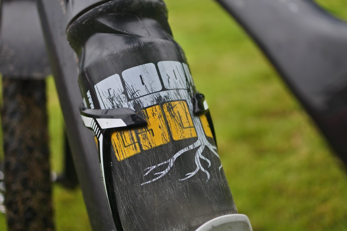 I have a lovely Crane E-Ne bell – it’s really for when I ride to the trails on the canal towpath but people respond well to it at races! I also run two bottle cages with my Roots Cycles water bottles in, a saddlebag of tools and even though it’s not meant for it, I put a TPU tube behind the door to access the shock.