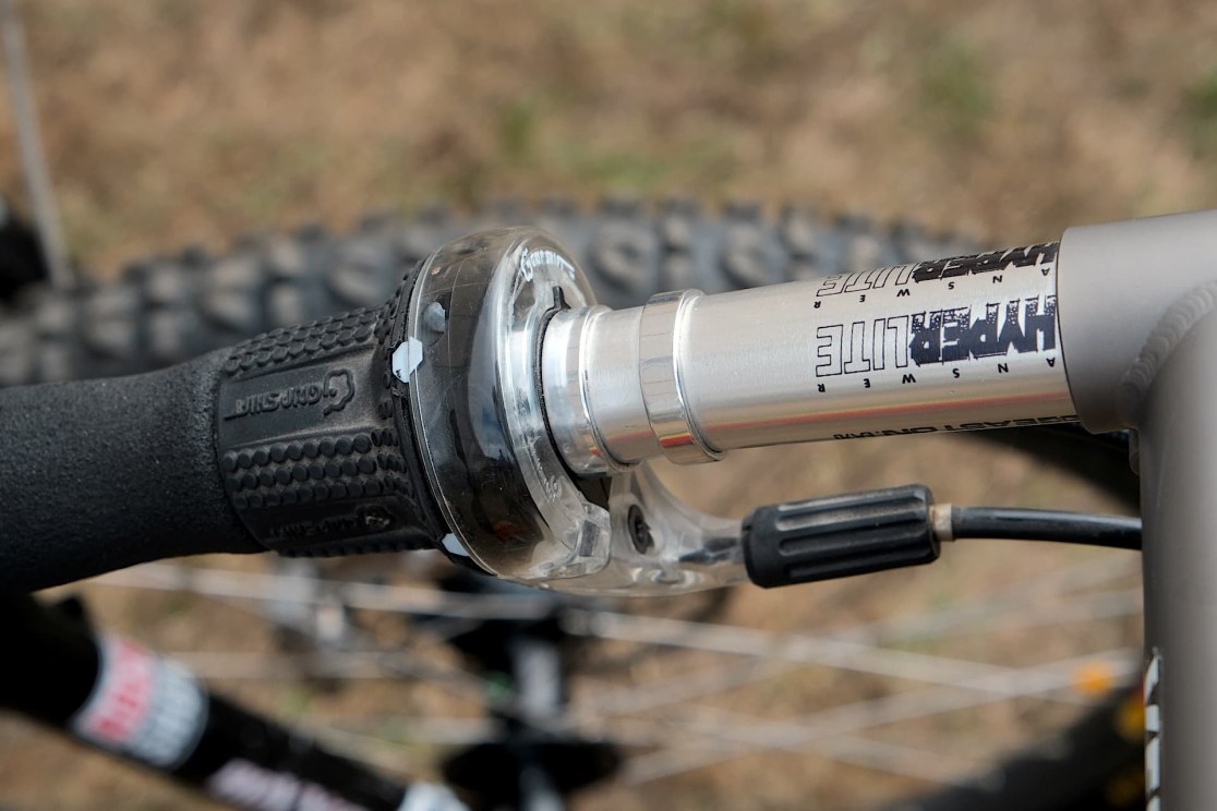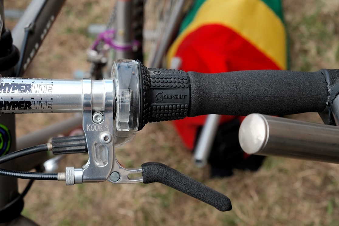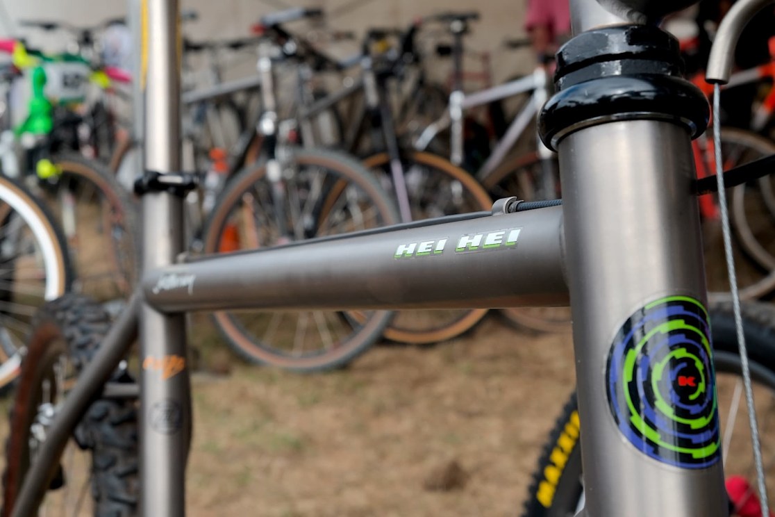 Yeah, I’m a really big Kona fan. I used to work in a Kona dealer and I’ve had many Konas over the years. The Hei Hei was something that just seemed like it was always out of reach and I would never get it. So to own one of these and have so many shiny titanium bits on it, yeah, this is probably one of my favourites of the whole collection. I used to use Gripshift X-Ray, bought with all the money that I earned doing paper rounds. But that was on a Raleigh M track, so that was a little bit different. This one’s just crazy light. I mean, I keep getting worried that it’s just going to get blown over in the wind.