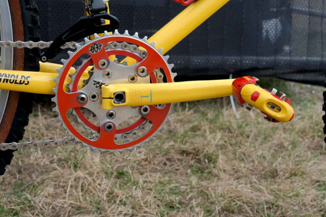 Yeah, the chain set, she couldn’t find a chain set that was short enough or light enough. So Andy Thompson built the cranks from tandem fork blades and they are 155mm long and they’re super light. It’s a two piece chain set so the bottom bracket is on the left hand crank and the chain rings are EGG, made in Wales.