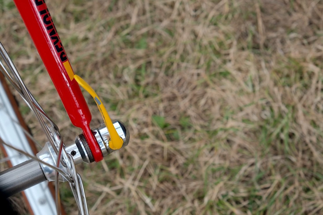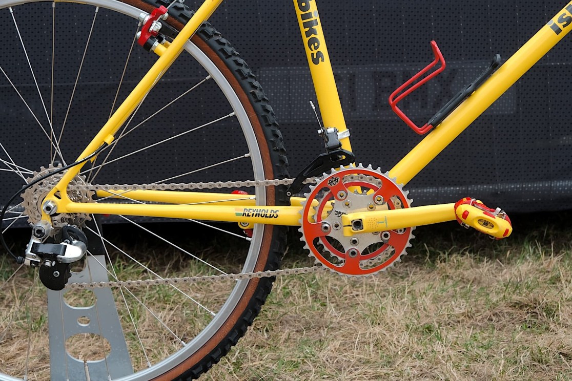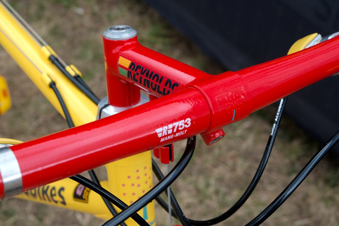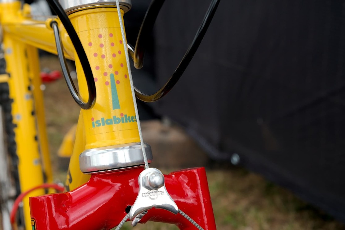 At the Retrobike Show and Shine at the Malverns Classic, this yellow and red bespoke racing machine was on display. It’s one of Isla Rowntree’s own personal bikes, built to meet her precise ideas about what makes a good race bike, and a bike that fits. For those familiar with her children’s range of Islabikes, you’ll see how she carried these features over to the kids’ range.