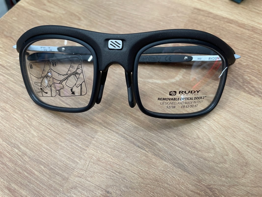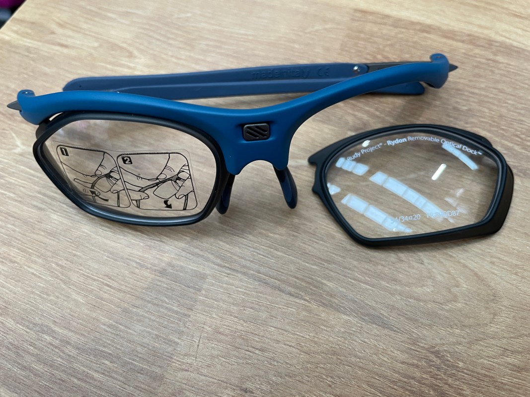 Okay… so this is a Rudy frame. It’s like the legs and the eyebrows. And then the eye bits, you get your optician to fill that bit and then you slot them in. So you end up with a single glazed pair of glasses, just like you would in a normal pair of off-the-peg sunglasses or prescription glasses, and you don’t have that double layer which you get with the RX insert.