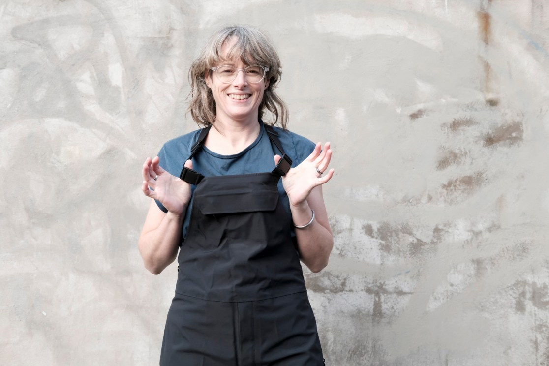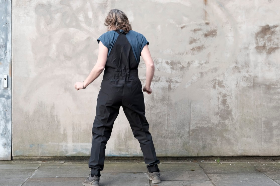 Hannah: “Sod the official name, these are dungarees. These come in three lengths and I’ve been wearing the Regular length, which is actually fairly long. The three-layer waterproof fabric has a slight stretch to it, but you should plan to have these moderately loose fitting, not tight – they’re not that stretchy. The fit is good. There’s plenty of room for knee pads. You can use the two-way zip on the right to let a bit of heat out.”