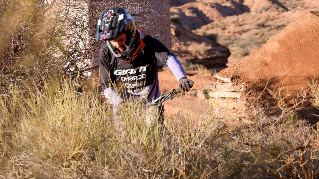 By the time the wind has dropped enough to consider sending riders up the hill, it’s 5pm. It’s the longest the organisers have ever waited to fit in second runs, but conditions are still less than ideal. Once they decide that the wind has dropped enough to offer riders the potential to complete runs, each competitor will get an eight minute slot in which to pick their moment. Dust devils swirl at the bottom of the course as Tommy G squeezes in his second run before his eight minute slot times out. It’s now Tom’s turn, and the clock starts to count down his opportunity to finally get that one smooth, linked run.
