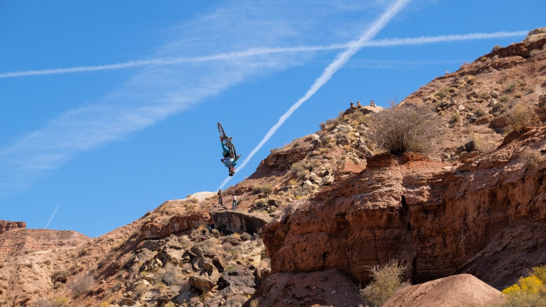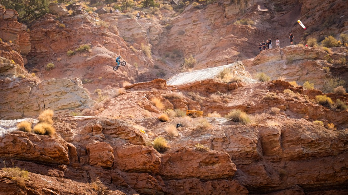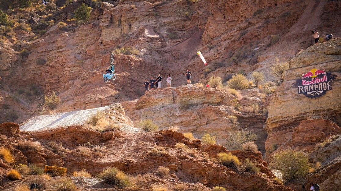 By the time he’s lining up at the start gate for his first ever top to bottom run at Red Bull Rampage, the helicopter is in the air and every move is being broadcast live. The commentator talks up ‘Ice-T’ and his fearlessness. In the sweltering heat of the late start, I wonder if that’s spelled ‘Ice-T’ or ‘Iced Tea’. A casual back flip up the top suggests he’s cool and comfortable, and he makes his way neatly through the definitely-not-slopestyle steep chutes. Then, a slight misalignment on the hip before the canyon has him hauling on the brakes – the angle was wrong and he wouldn’t have the speed needed for the canyon. He hikes his bike back up, to the start of the take off from which he’s down his first two attempts on the BFC. To the relief – and cheers – of everyone, he clears it and sticks the landing, riding on through his line and into another back flip. The wind whips up clouds of dust as he heads towards the lower drops, a windsock horizontal as he drops back into the shadows then pops out into the sun for the shark fin. He flips the shark fin, just holding on to the edge of the trail, but once again hauling on the brakes as his speed is off for the next shark fin. Momentum lost, but skin saved, he rolls through to the finish corral, skipping his final showtime jumps.