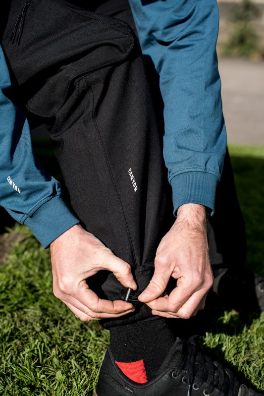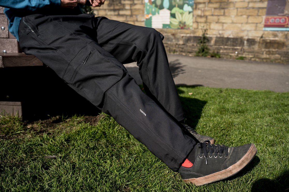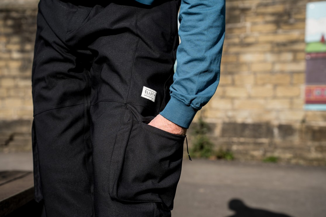 Something of a curious garment (maybne we’re just old?). T400 material (79% Polyester, 21% organic cotton). Large side pockets with zip. Integrated belt with clip.The leg cuffs have elasticated drawstrings, “this allows you to pull the trousers up over the calf on the chainring side to prevent them from getting caught in the chain when riding.” But these aren’t reall riding trousers. All five pockets have YKK zips with fine teeth so as to be “smooth-running and … not scratch your hands when you reach in.”
