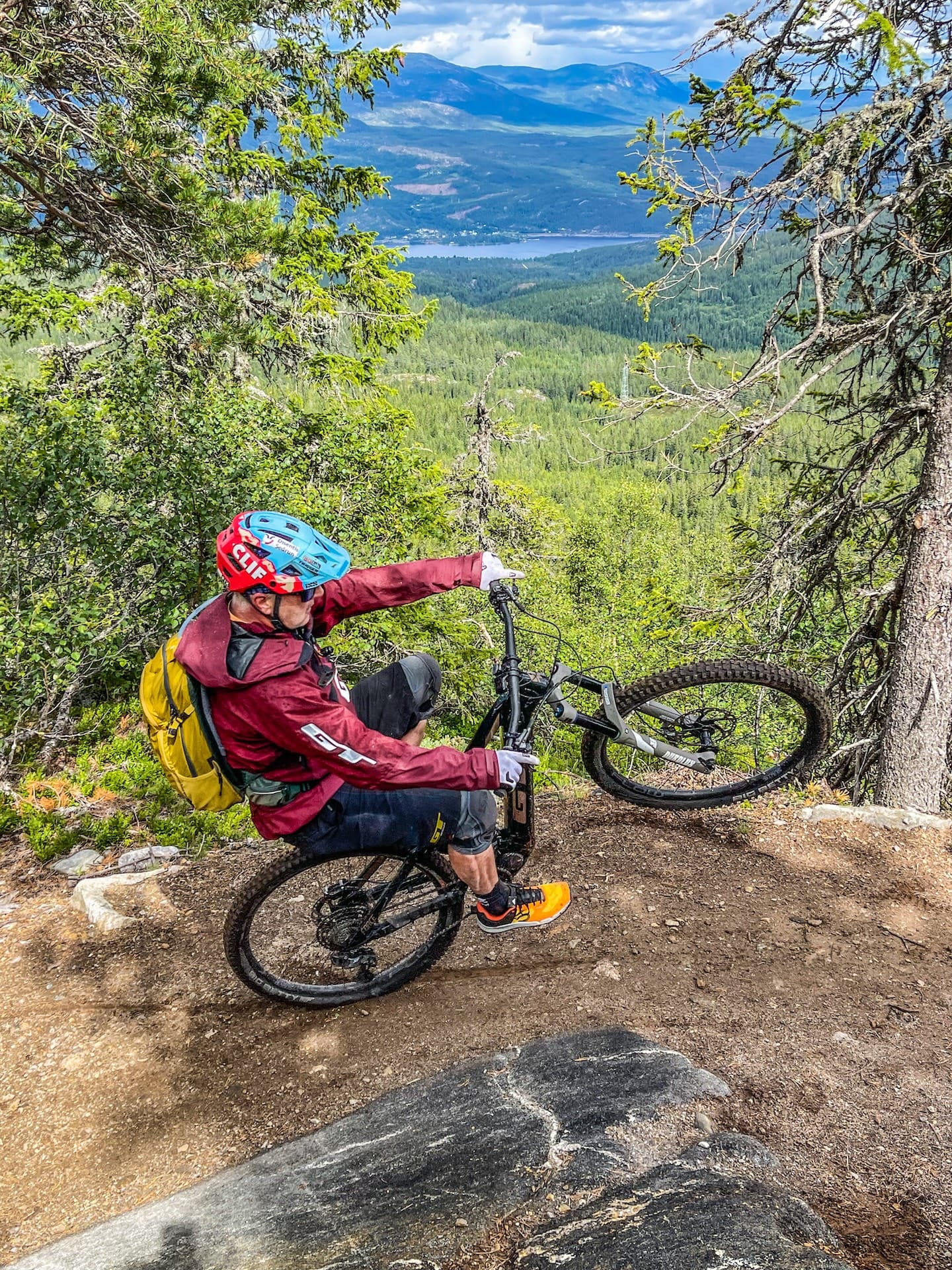 Pedalling up the mountain in Trail mode, Hans was also putting his new GT e-Force with Shimano EP801 drive unit through its paces; this system has more power and torque, it is smoother and lighter than before. Once at the top, Hans noticed a giant rock and since he loves to play on his ebike, pushing his skills, he had to climb and then roll it.