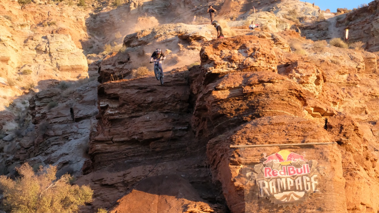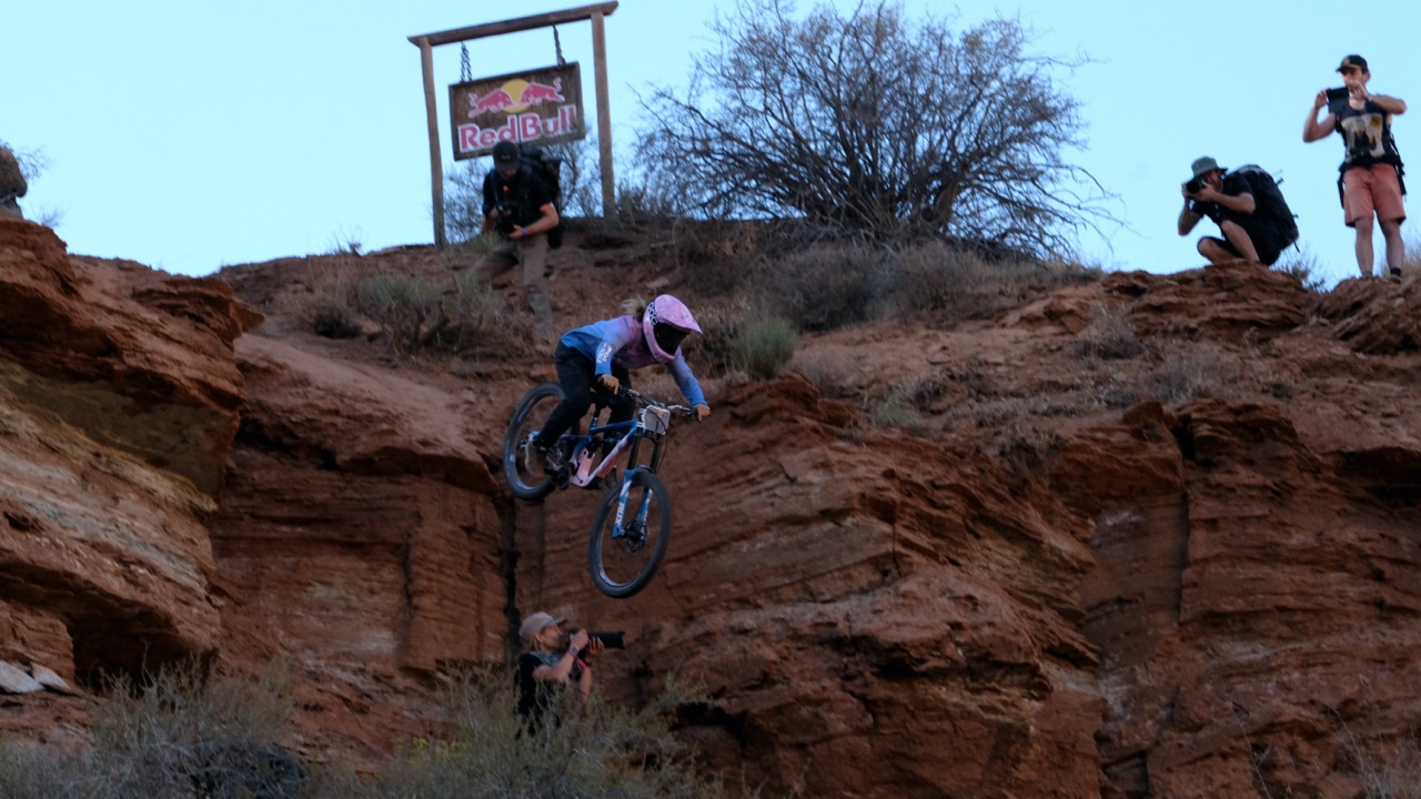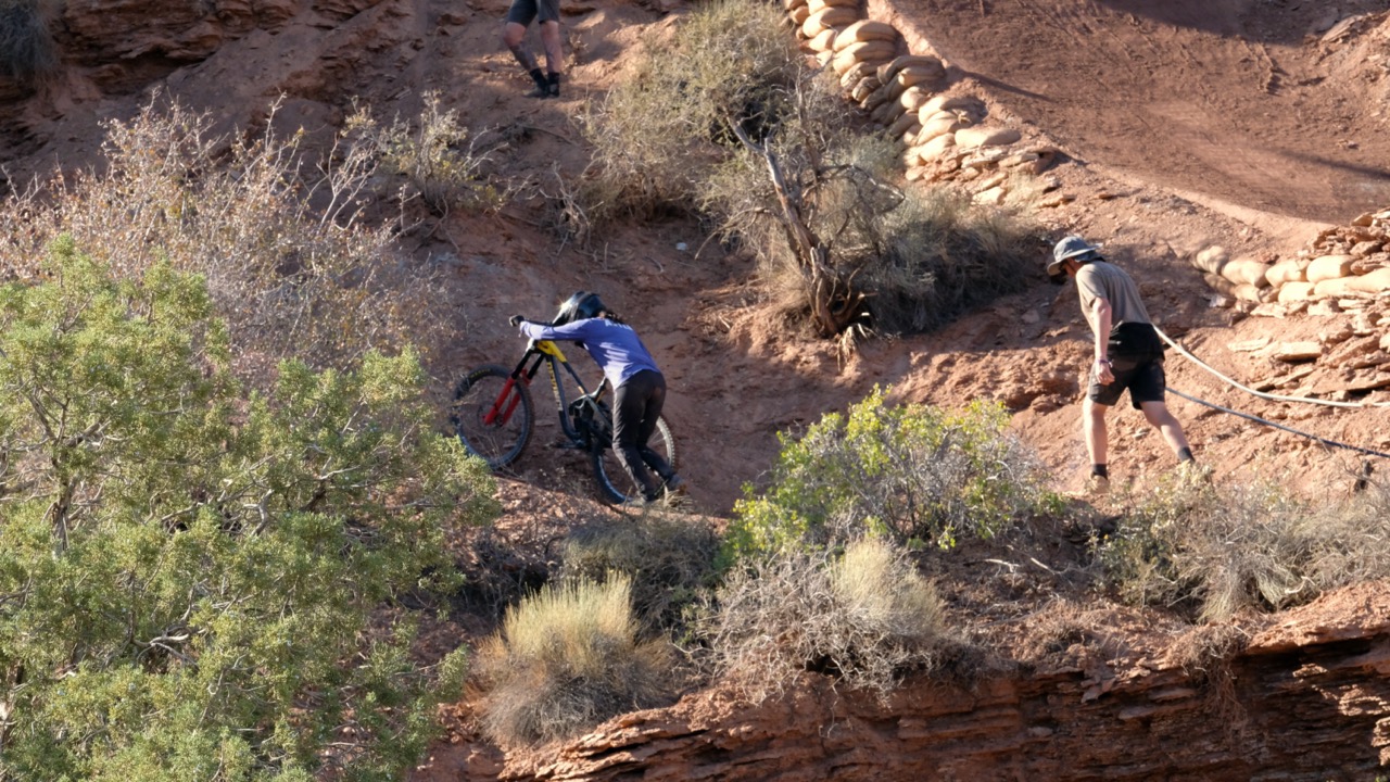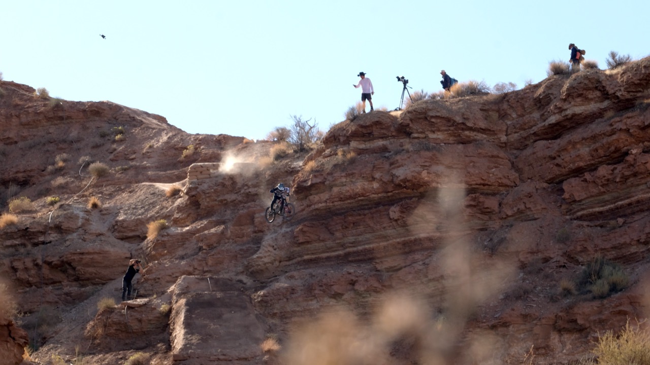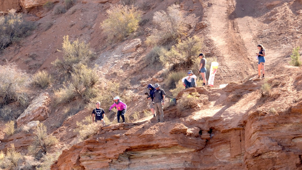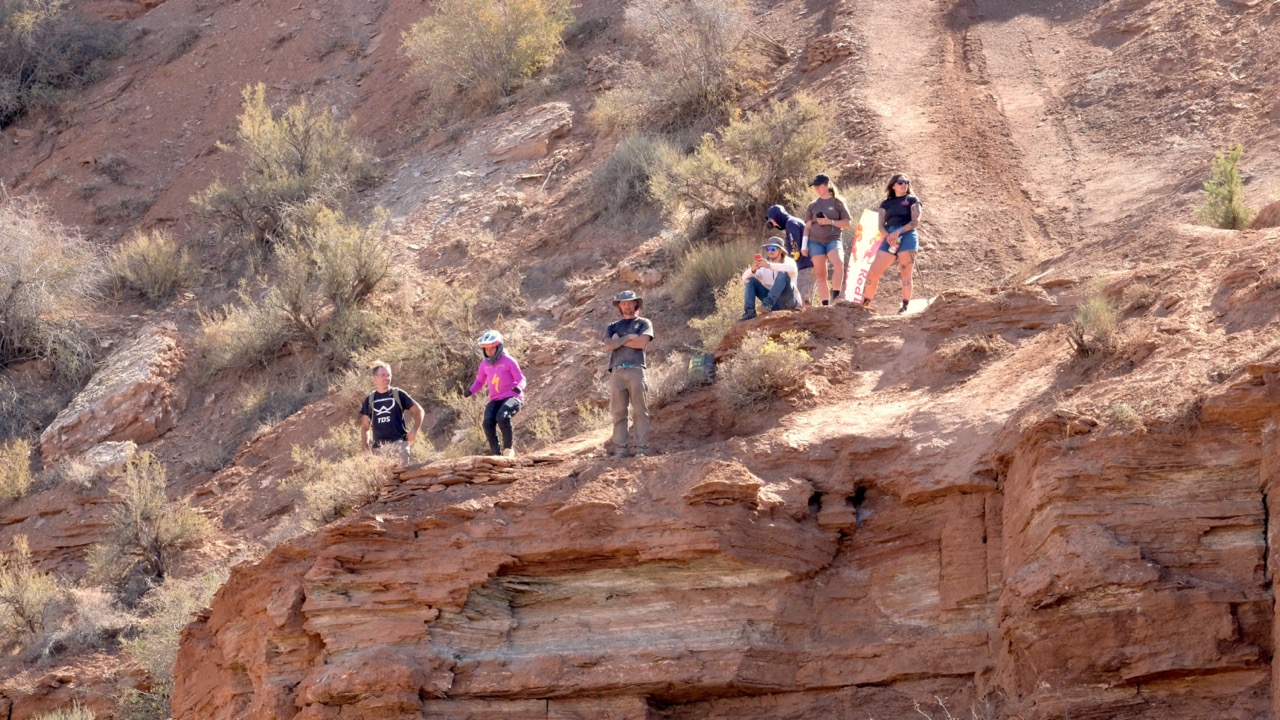 Today was the last day of practice for the women, tomorrow is showtime. But when you watch Red Bull Rampage on the TV, with all the Loud Hype Stoke production values, you’re seeing a teeny tiny tip of the iceberg. You’ve missed the days of digging, and of climbing up and down the hill on narrow tracks more suited to goats. It’s really not possible to overstate just how physically exhausting that is. Both previous days, I’ve been on site for less time than the riders (media shuttles leave long before the evening riding finishes and it’s a long hot walk out if you miss them), and while I’ve walked and climbed plenty, I’ve not been wielding a shovel. Both days, I’ve crawled into bed by 9pm, head pounding from the heat and dehydration – despite drinking many litres of electrolyte drinks. One of the diggers told me they were drinking nine litres of electrolytes per day. The sun is baking. The wind is warm. The shade is warm. Nothing is cool, never mind cold. I know I’ve said this all before, but this year is particularly hot – it hasn’t really cooled down at night. It’s against this backdrop of exertion and endurance that the riders line up to hit the last of their features and string them together.