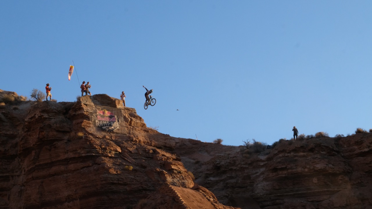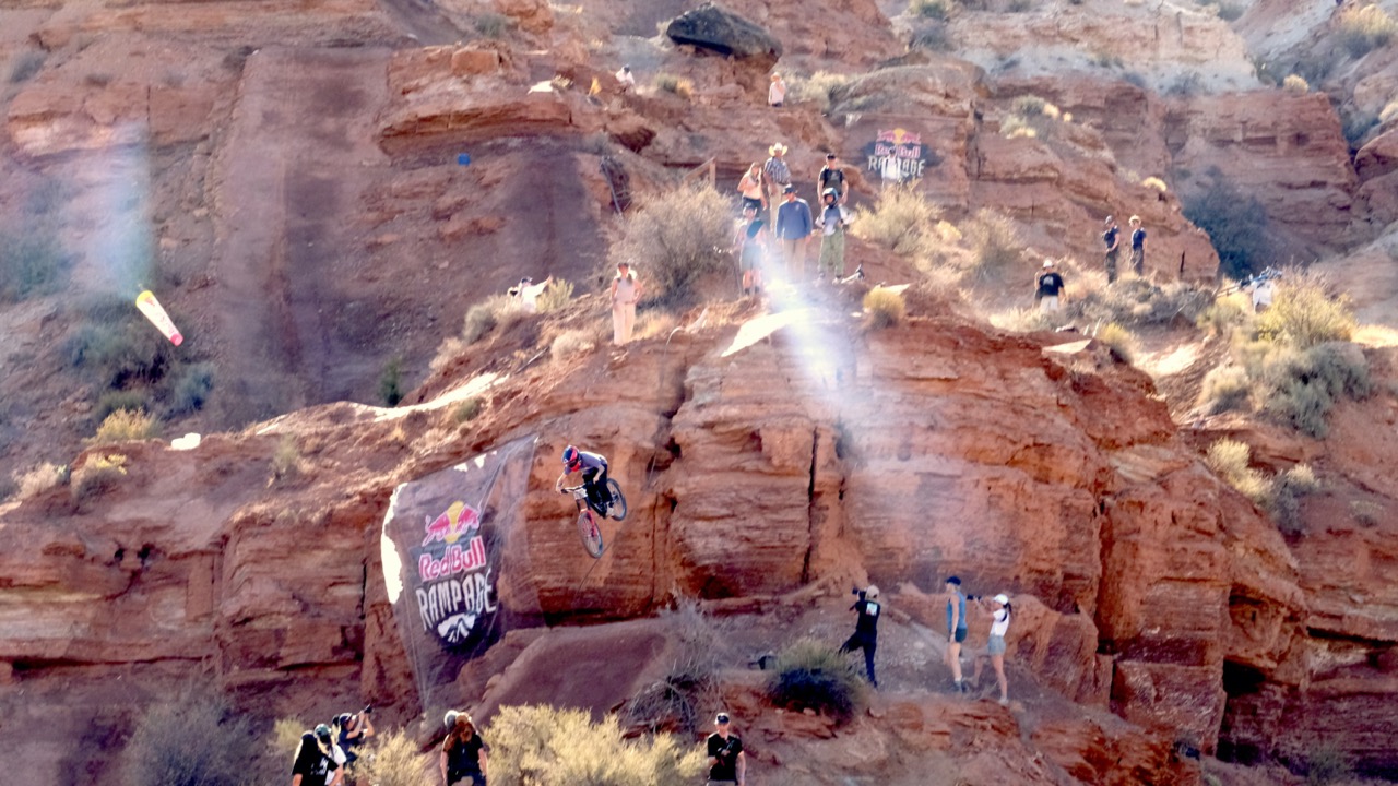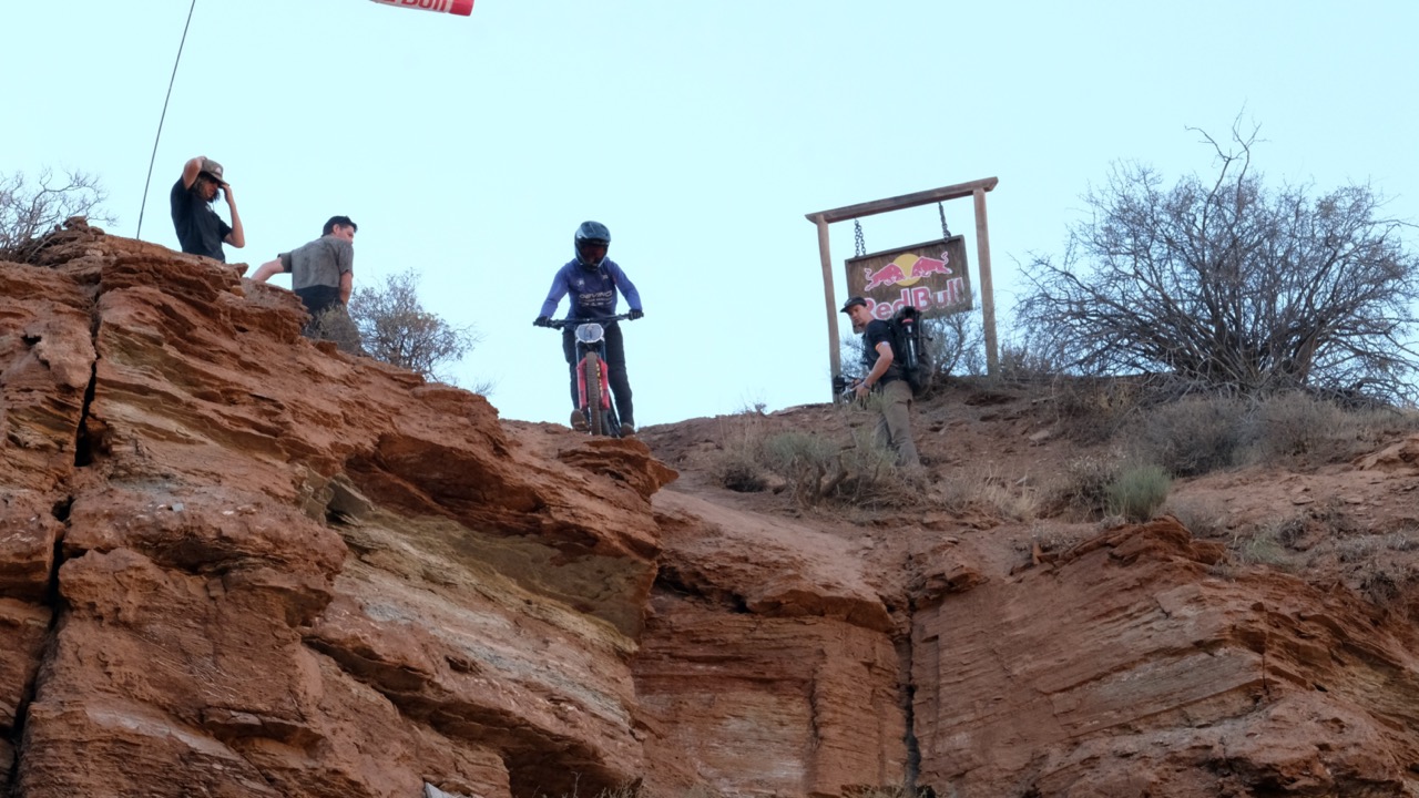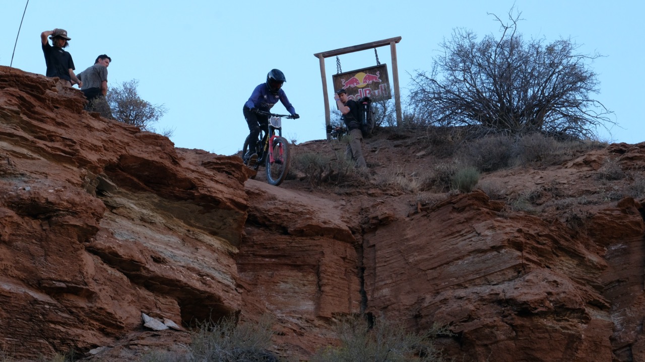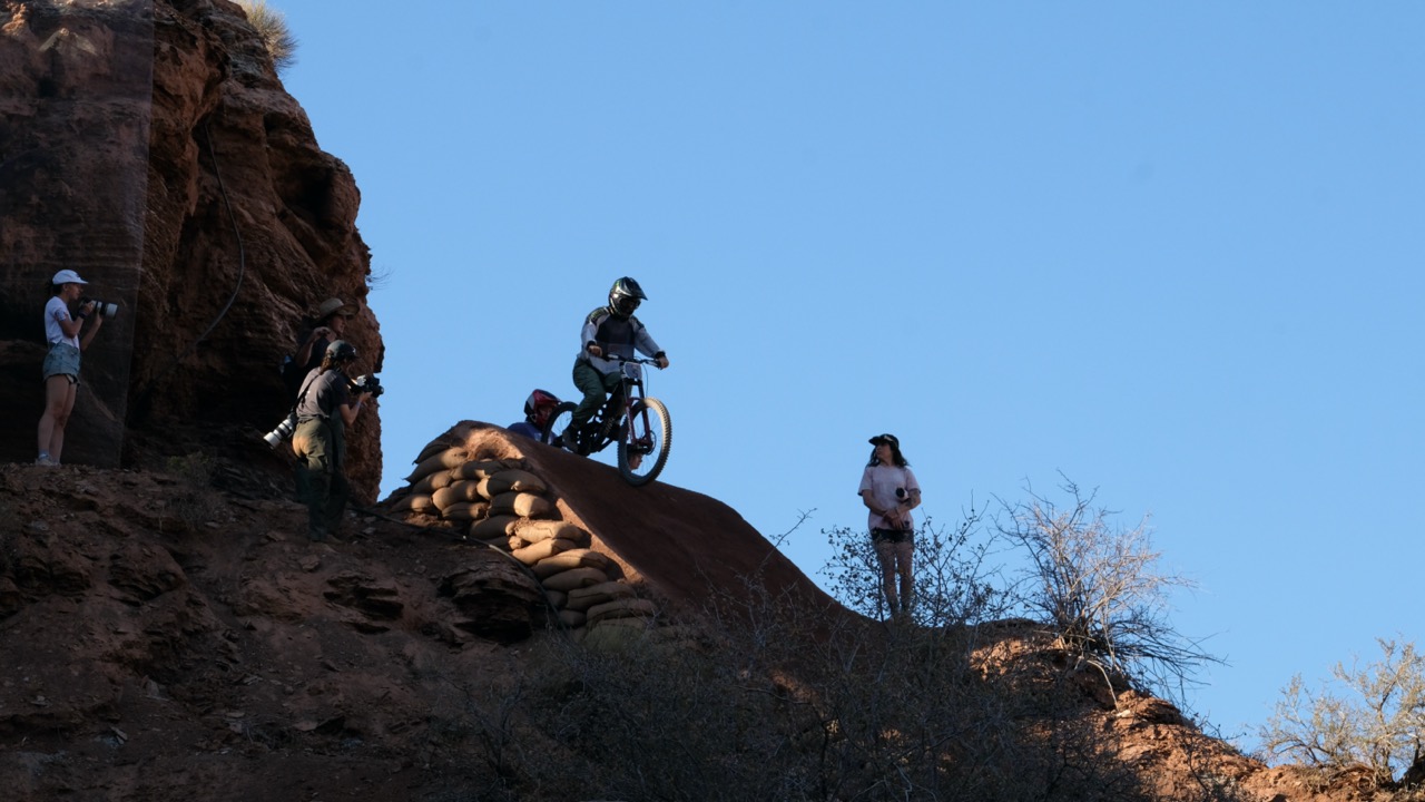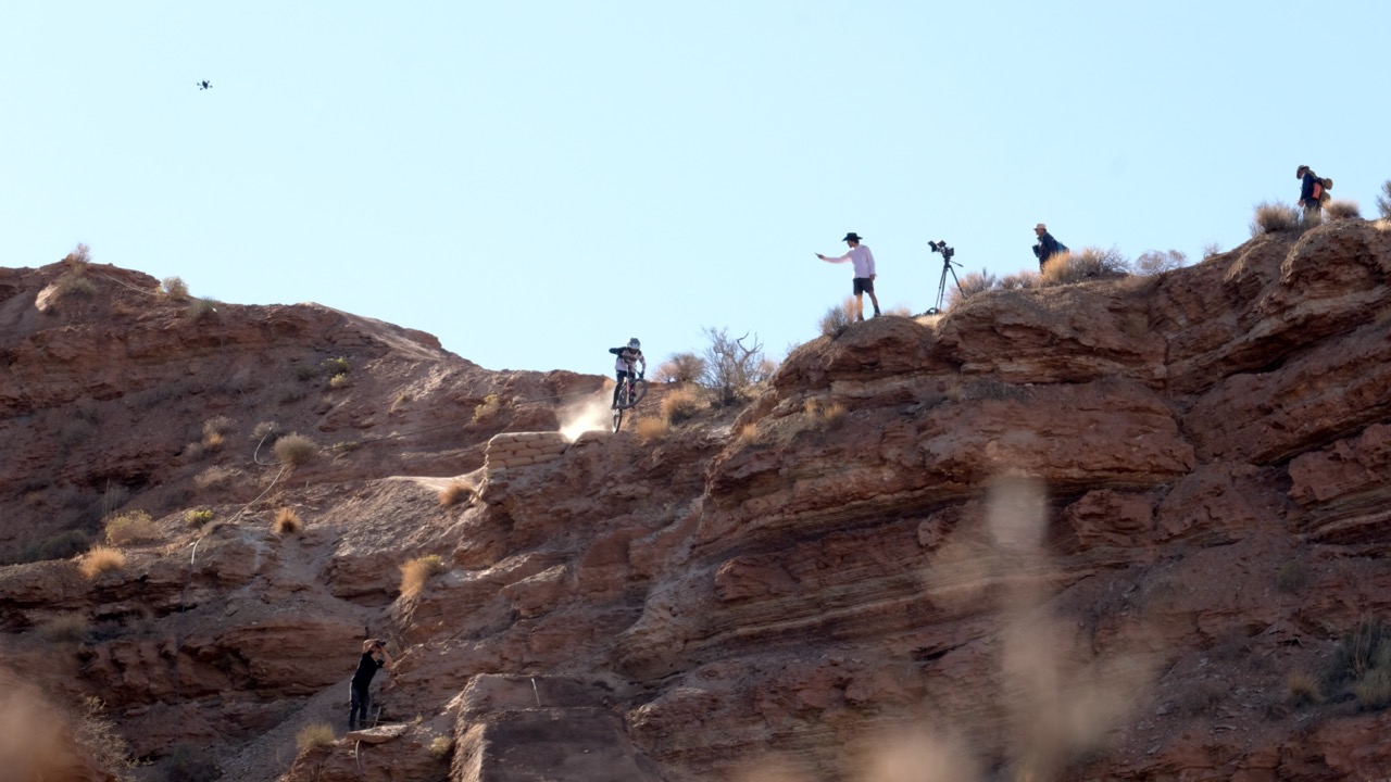 Today was the last day of practice for the women, tomorrow is showtime. But when you watch Red Bull Rampage on the TV, with all the Loud Hype Stoke production values, you’re seeing a teeny tiny tip of the iceberg. You’ve missed the days of digging, and of climbing up and down the hill on narrow tracks more suited to goats. It’s really not possible to overstate just how physically exhausting that is. Both previous days, I’ve been on site for less time than the riders (media shuttles leave long before the evening riding finishes and it’s a long hot walk out if you miss them), and while I’ve walked and climbed plenty, I’ve not been wielding a shovel. Both days, I’ve crawled into bed by 9pm, head pounding from the heat and dehydration – despite drinking many litres of electrolyte drinks. One of the diggers told me they were drinking nine litres of electrolytes per day. The sun is baking. The wind is warm. The shade is warm. Nothing is cool, never mind cold. I know I’ve said this all before, but this year is particularly hot – it hasn’t really cooled down at night. It’s against this backdrop of exertion and endurance that the riders line up to hit the last of their features and string them together.